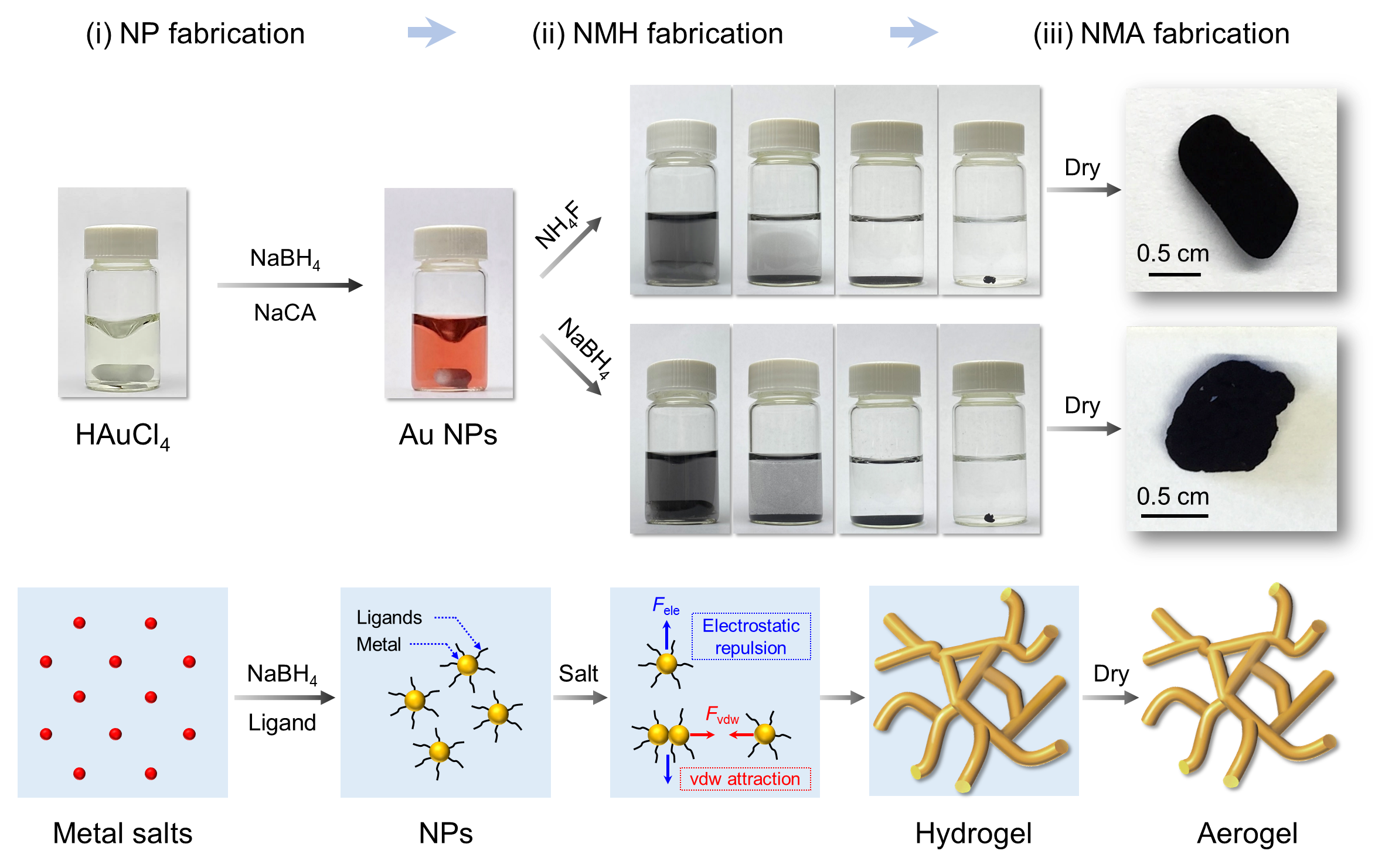 Figure 1 NMA synthesis procedure and the underlying mechanisms. The procedures include (i) the formation of colloidal NPs, (ii) the assembly of the NPs into a hydrogel, and (iii) drying to yield the aerogel.