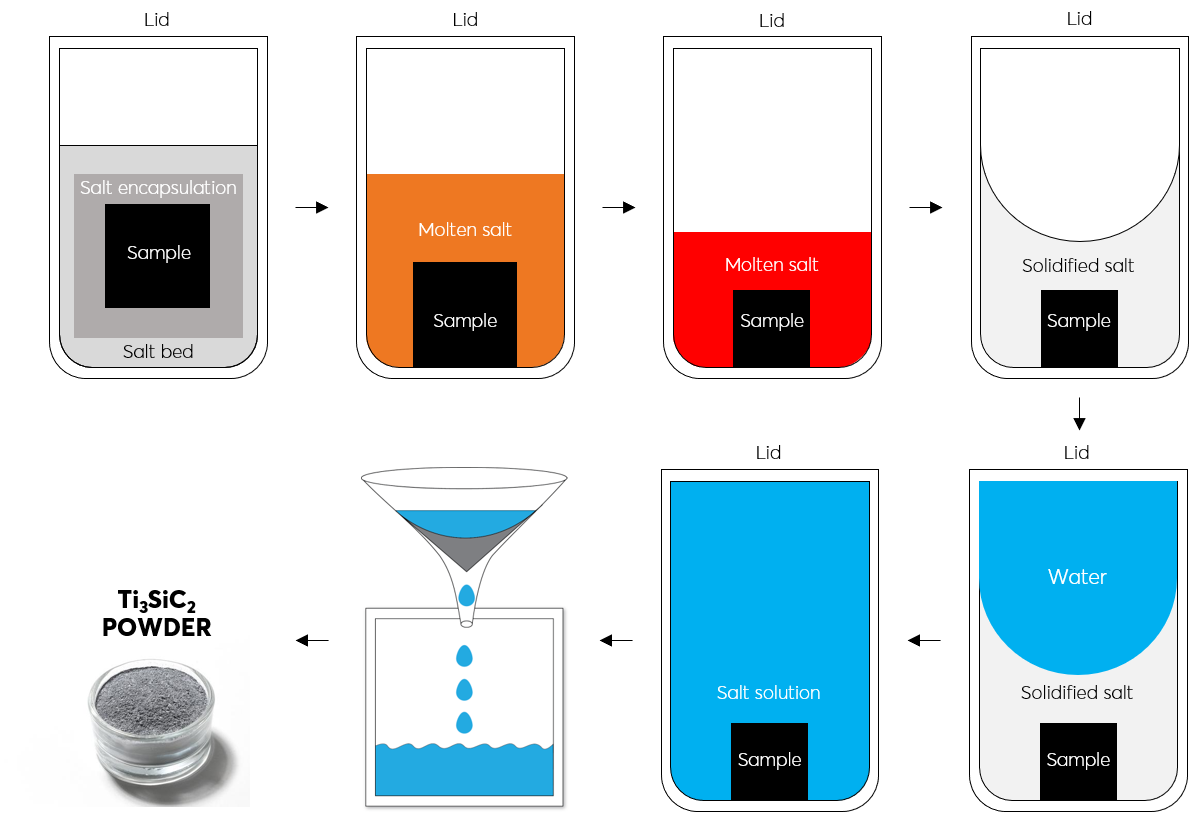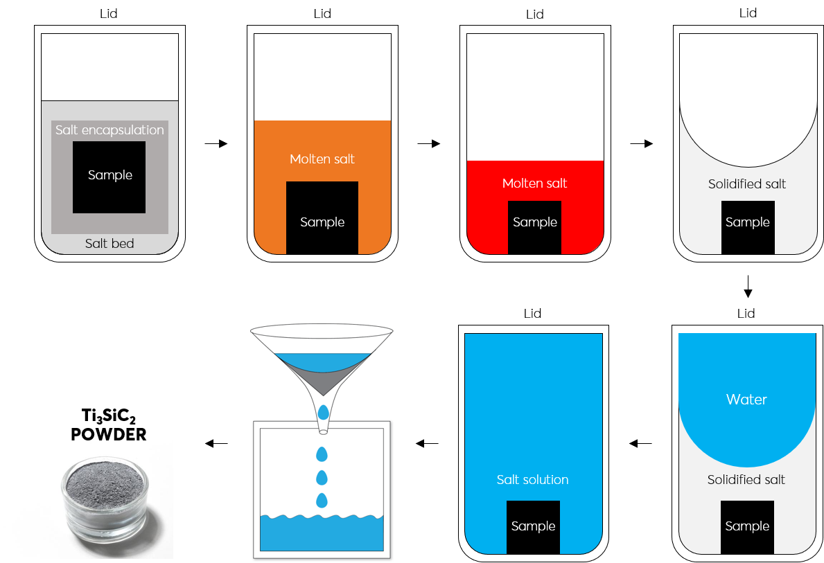 As the basis of cooking is chemistry, very often scientists inspire themselves with simple kitchen practices to answer bigger questions. Taking an example of baking a cake, we need wheat flour which is a powder. We cannot bake with whole wheat. Similarly, we also need ceramic powders for the fabrication of complex shapes. Within my example of Ti3SiC2, the reaction of Titanium, Silicon, and Carbon leads to a solid block of material that needs to be pulverized to obtain powders. The grinding process consumes energy and the use of salt avoids the grinding step all together. After reaction at high temperature, the salt grains sit in between titanium silicocarbide grains. The salt is simply washed with water to obtain free-flowing powder without any grinding step.