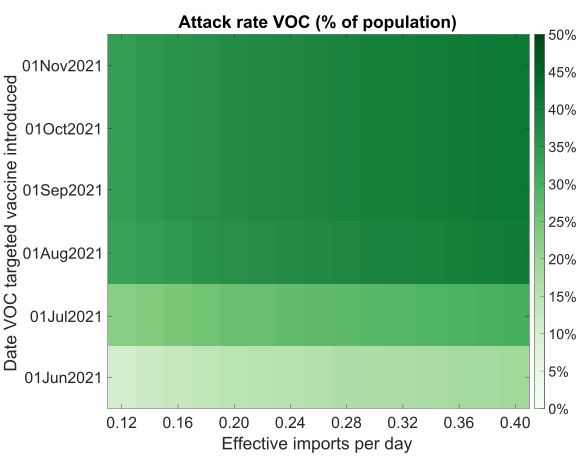 For our final piece of analysis we used stochastic modelling approaches to explore how the timing of the introduction of a presumptive VOC-targeted vaccine and the rate of VOC introductions into the population impact the trajectory of the epidemic.
