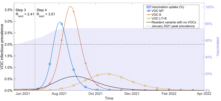 Figure 1: Using our simple SARS-CoV-2 transmission model, VOC infectious prevalence over time for our three example VOCs: more transmissible (VOC MT, blue line with square markers), equal transmissibility with immune escape (VOC E, orange line with plus sign markers), less transmissible with immune escape (VOC LT+E, yellow line with circle markers). We also show resident variants alone in the absence of any VOC being introduced (black line with no markers). We represent the vaccine uptake in the population through time via background shading. The vertical solid line was the earliest possible transition time into Step 4 of the relaxation roadmap in England (21st June 2021), resulting in a change in strength of nonpharmaceutical interventions.