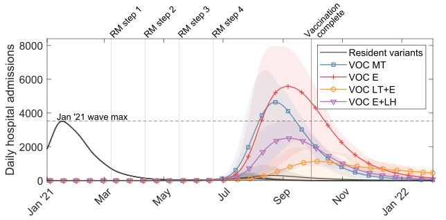Figure 2: Using our age-structured SARS-CoV-2 transmission model, time series of estimated daily hospital admissions (thousands) for our example VOC scenarios. Solid lines show the mean at each timepoint and the shaded ribbons visually represent a range of predicted outcomes (95% prediction intervals). The vertical light red line corresponds to the projected date under our vaccine roll-out speed assumption where all those in the adult population (18+ years) in England who accept the vaccine would have received two doses. We also present an additional VOC, similar to VOC E, except with a lesser reduction in vaccine-derived efficacy against hospitalisation (VOC E+LH, purple, inverted triangle markers).