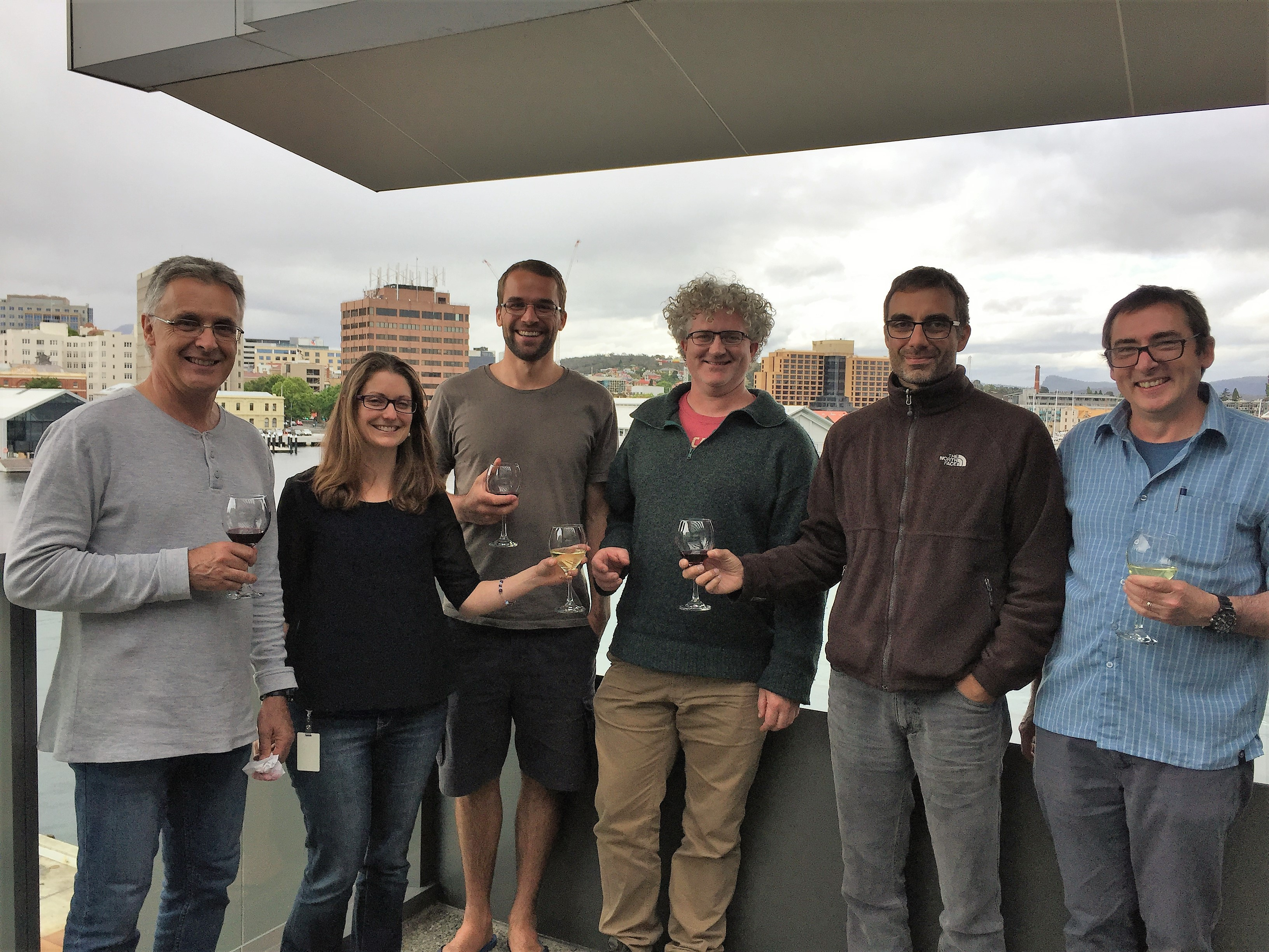 Collaboration across disciplinary boundaries is key. From left to right some of the authors of this study: Craig Johnson, Nicole Hill, Jan Jansen, Mike Sumner, Marc Eléaume & John McKinlay. Photo: Sam Peel