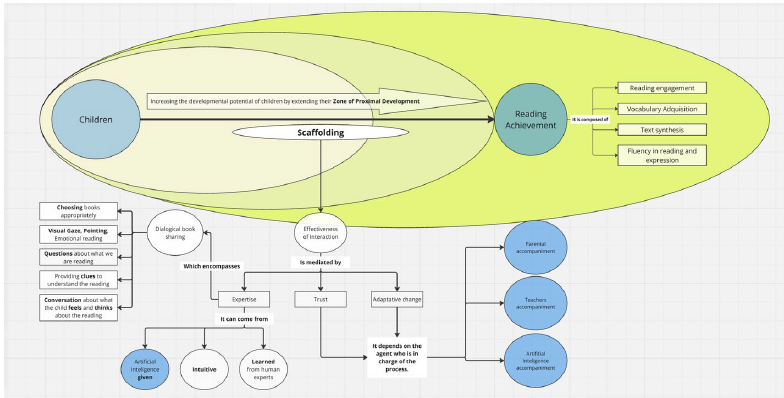 In those quiet, familiar moments, something developmentally profound is taking place. Shared reading is not just about learning words or following a story. It is a rich social interaction in which adults guide attention, interpret emotions, ask questions, and connect the story to the child’s own experiences. Developmental psychology describes this kind of adaptive, responsive support as scaffolding: the process by which an adult or an expert pair helps a child achieve beyond what they could do alone. Those everyday moments of shared reading and domestic interactions are among the most powerful developmental experiences in early childhood. They are where language expands, attention strengthens, emotions are interpreted, and thinking skills grow. The complexity and enhancement potential of those moments and experiences are guiding our work, illustrated in Fig. 1, and integrating these concepts into a model for how scaffolding, enacted through practices like Dialogical Book Sharing (DBS), facilitates desired learning outcomes.