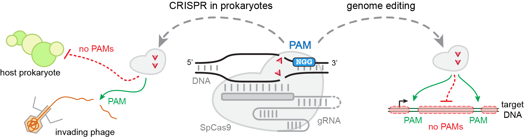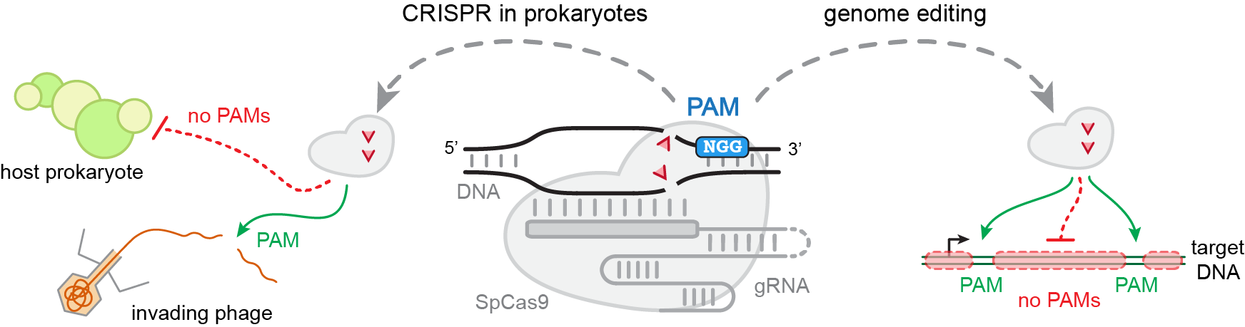 Figure 1. SpCas9 requires an NGG PAM sequence to target DNA, playing an important role in prokaryotic CRISPR immune systems but limiting target range in genome editing applications.
