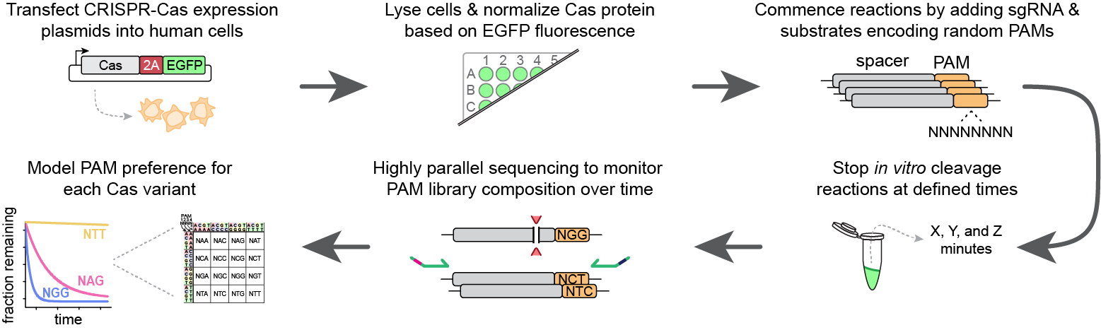 To alter the PAM requirement of SpCas9, we needed a method to determine how amino acid changes to the SpCas9 protein corresponded to changes in PAM recognition. Both the accuracy and throughput of the method would be essential; the assay had to recapitulate PAM requirements in human genome editing applications and the throughput would determine the size of the mutation space we could explore. We developed the high-throughput PAM determination assay (HT-PAMDA) to permit the scalable characterization of the PAM requirements of Cas enzymes and enable protein engineering projects that were previously infeasible(1). HT-PAMDA is based on in vitro cleavage of plasmid libraries harboring a target site and flanking randomized sequence in place of the PAM by Cas9 or other Cas enzymes. The composition of PAMs in the library are determined by next generation sequencing at multiple timepoints to monitor the depletion of targetable sequences over time (Figure 2). While so-called “depletion” approaches are common for characterizing PAM requirements, HT-PAMDA is unique in its design to enable rapid and scalable characterization while reflecting enzyme performance specifically in human genome editing applications.