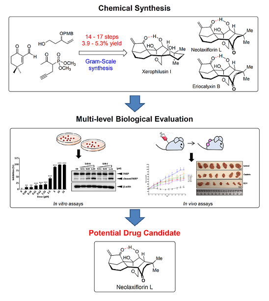 A solution to the above problem could exist in pairing chemical synthesis with multi-level bio-evaluation. A scalable synthesis method would allow us to produce large quantities of compounds, without relying on their extraction from plants. The increased quantities from synthesis would enable us to conduct both cell line and animal studies, to more comprehensively assess the anti-cancer activity of the compounds. In our paper we employed the above strategy to identify, for the first time, a low-abundance Isodon diterpenoid, neolaxiflorin L, as a promising drug candidate with strong anti-cancer effects in animals. This finding is significant, as the compound may otherwise have been neglected due to its low abundance in plants (3 mg per 10 kg dried leaves of I. eriocalyx var. laxiflora, 0.00003% isolation yield) and moderate activity in cell lines.