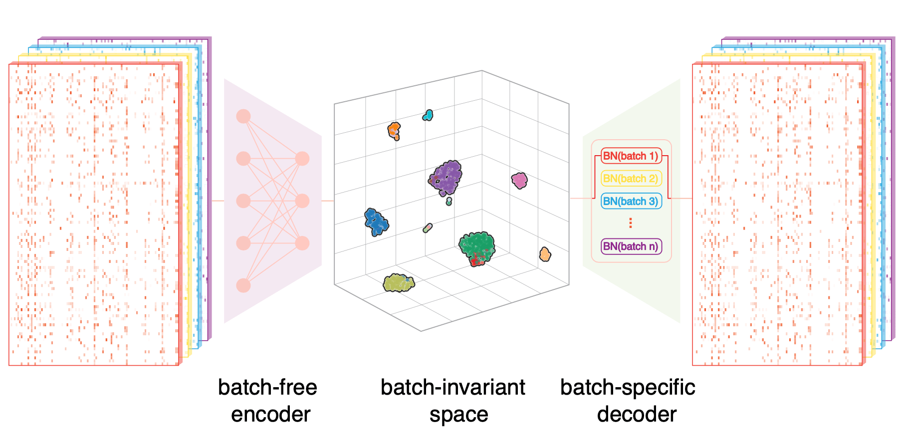 Fig 1. The design of SCALEX. A generalized encoder projects heterogeneous sources of data onto the “biology-preserved” cell embedding space, while a batch-specific decoder is responsible for batch-related variations in variational autoencoder4 framework.