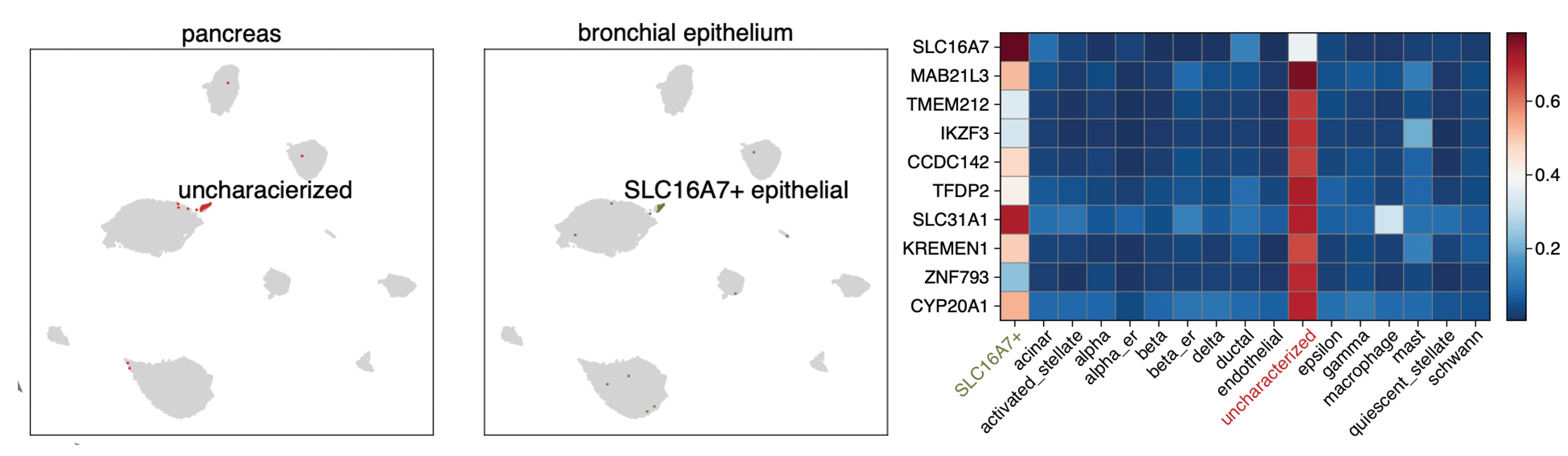 Upon using the generalized encoder to project/whatever the new datasets, it was exciting when we found a new cluster of cells in pancreas datasets displaying the high expression levels of known epithelial cells. We then assembled a collection of epithelial cells and project them to the pancreas cell space. found the found SLC16A7+ epithelial cells from bronchial epithelium, a very different datasets from pancreas, also expressed the similar gene expression. Strikingly, we found these epithelial cells consistently mapped with the new identified clusters Fig 2. We anticipate that in the future there will be many such discoveries of shared rare cell types among diverse sample types enabled through SCALEX-based online integration to bridging heterogeneous datasets.