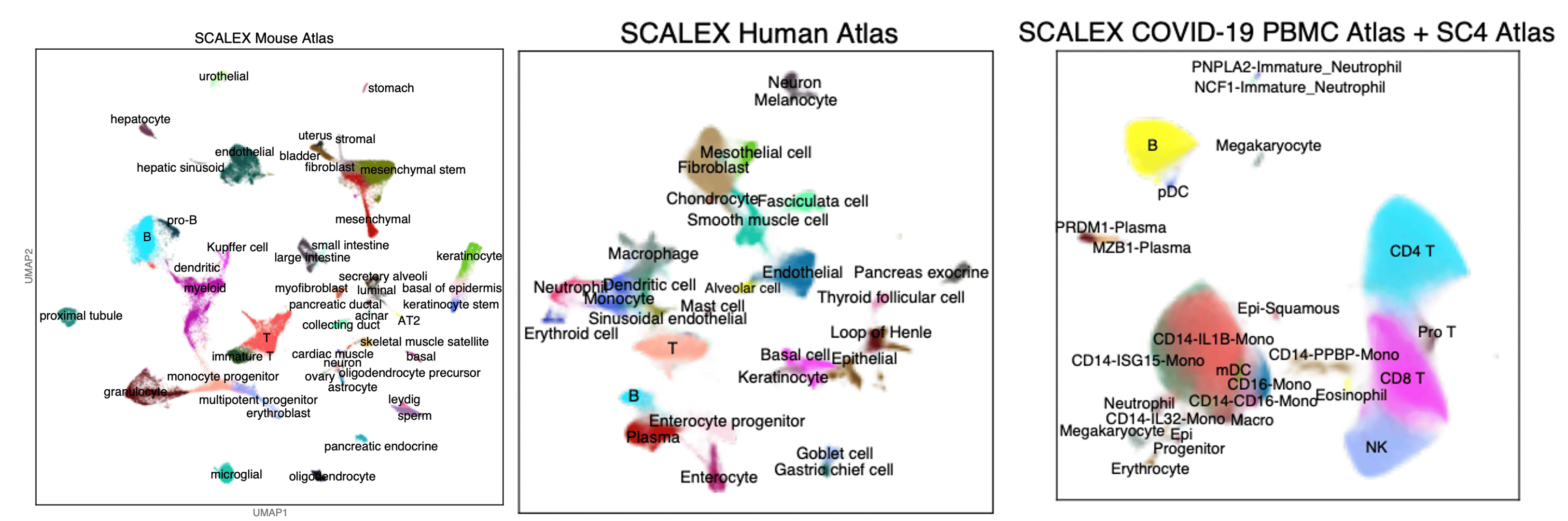 Fig 3. UMAP embedding/projection of a Mouse Atlas, a Human Atlas, and a COVID-19 Atlas built using SCALEX.