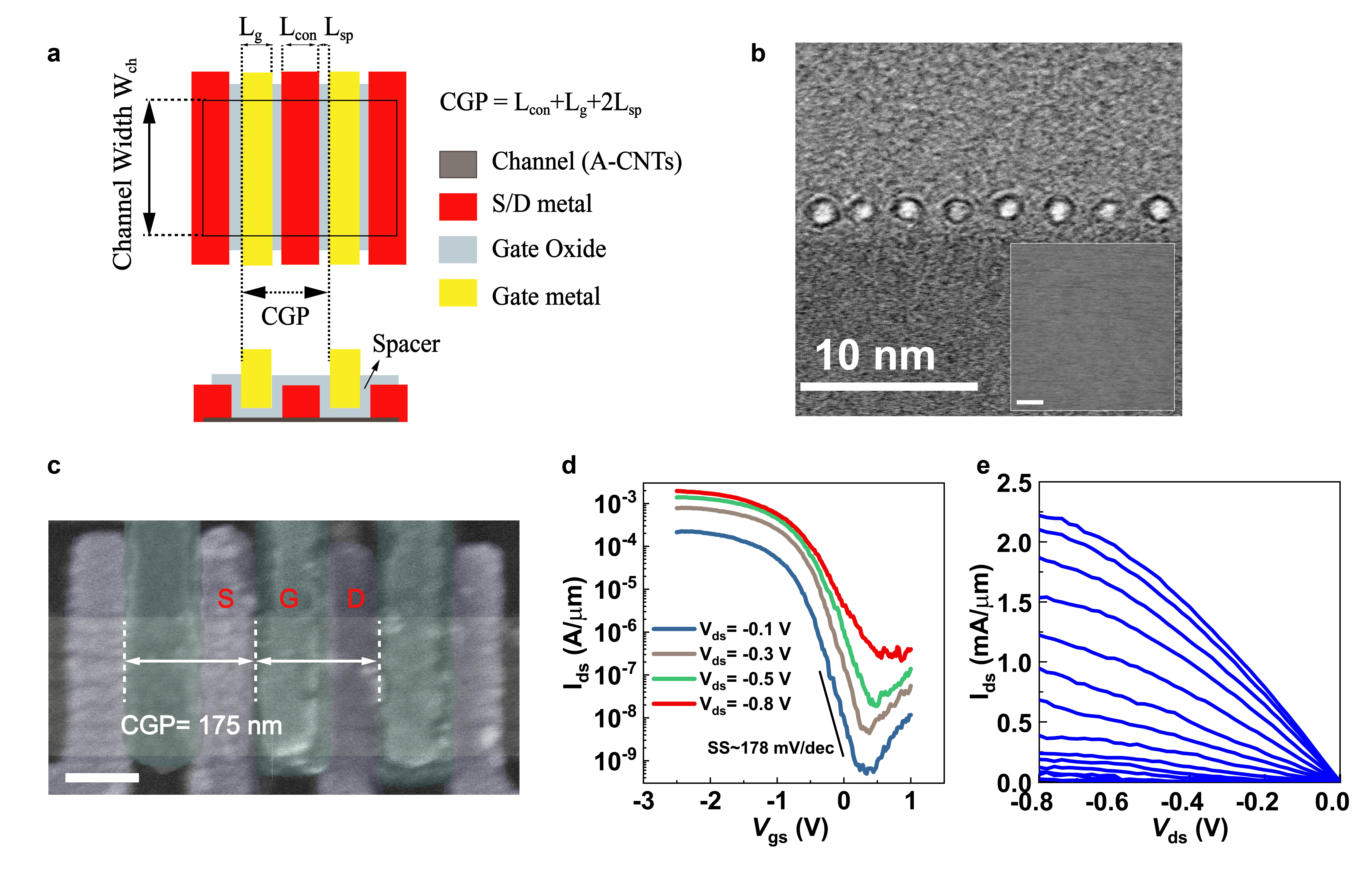 In our recent study published in Nature Electronics, we fabricated A-CNT FETs with a contacted gate pitch of 175 nm, achieved by scaling the gate length and contact length to 85 nm and 80 nm, respectively. Remarkably, the A-CNT FET exhibited an impressive on-current of 2.24 mA μm-1 and a peak transconductance of 1.64 mS μm-1, surpassing the size and electronic performance of silicon 45 nm node transistors (Fig.1).