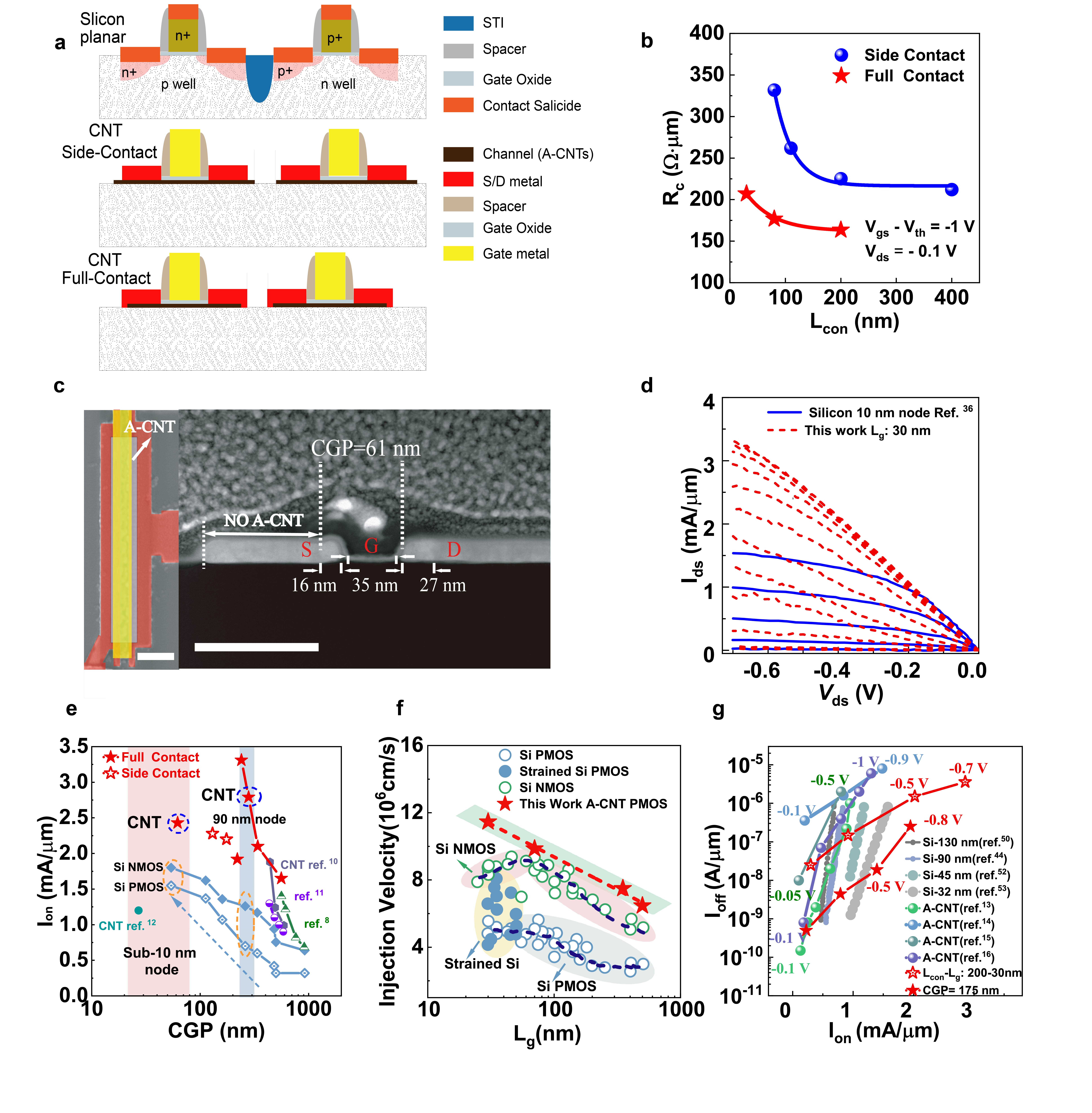 To further enhance the performance and reduce dependence on the contact length, we introduced a full-contact structure between the metal and nanotubes. The full-contact structure combined the carrier injection mechanism of side contact and end contact, i.e., the carriers can be injected from the metal to CNTs at the side (length-dependent) and at the edge (length-independent). Therefore, the full-contact A-CNT/metal junction exhibited lower contact resistance than the side-contact or end-contact junctions while maintaining a weaker contact length dependence. This enables aligned CNT FETs to be further downscaled to CGP below 55 nm (corresponding to the 10 nm technology node), while outperforming 10 nm node silicon transistors due to their high carrier mobility and Fermi velocity. These results illustrated the potential of A-CNT FETs for high-performance digital ICs at sub-10 nm nodes and provides flexibility for the trade-off between the gate length and contact length for further whole downsizing (Fig.3).