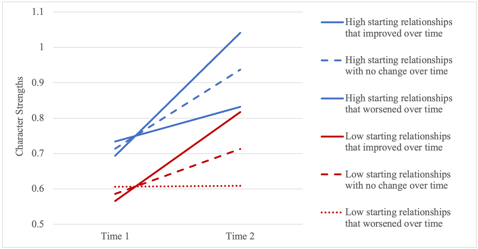 Almost 2,000 children from the city of Curitiba, in the state of Parana in Brazil, completed self-reports of their relationships with teachers and peers. We also asked our participants to fill out measures of virtues which included hope, self-control, justice, courage, pro-social leadership, social responsibility, and teamwork. For most of the virtues we measured, reports increased over the course of the three months of the study. More importantly though, the students who started out with the strongest relationships also started with the highest rates of self-reported virtues. In addition, those who strengthened relationships in the school context throughout the study had the greatest increases in virtues as well. Meanwhile, those who started with poor school relationships but found that they improved throughout the study, also reported steep gains in virtues.
