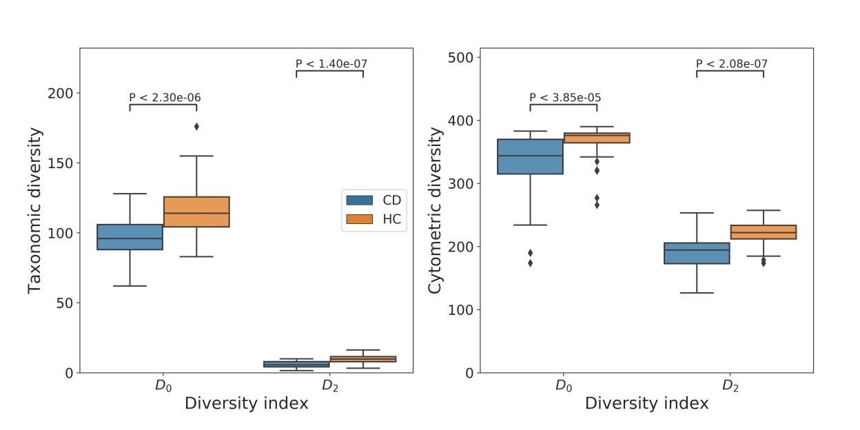 Results were twofold; first, we noticed that the cytometric diversity indicated a similar trend compared to the taxonomic diversity. Both types of diversity were considerably lower for CD than HC samples (see Figure below). Second, the predictive performance based on flow cytometry was high and close to the one based on 16S rRNA gene sequencing. Flow cytometry successfully captured differences between CD and HC gut microbiota.