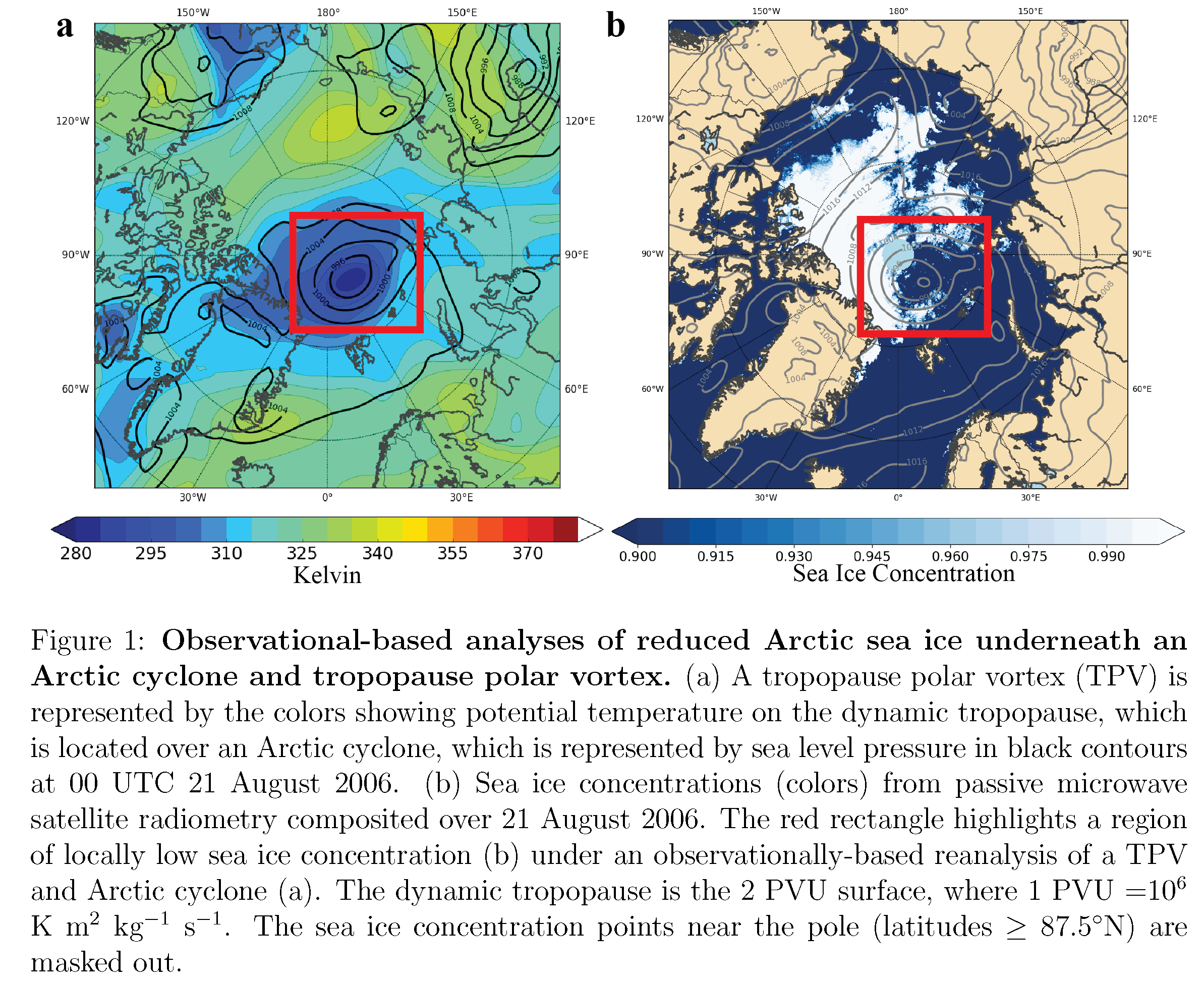 Our research team soon began examining past events of Arctic cyclones and noticed that the 2012 cyclone was not an isolated event and that there had indeed been numerous other cases of very rapid sea ice loss events associated with Arctic cyclones in the past. For example, Figure 1 shows a case of an event in August 2006 with an Arctic cyclone in close association with a tropopause polar vortex (TPV) and reduced sea ice near the same locations. However, none of the previous sea ice loss events had occurred over as widespread of areas as observed in 2012. What had changed? Furthermore, not every cyclone was associated with rapid sea ice loss, and we soon learned that, in contrast, most cyclones did not lead to sea ice loss. In fact, some cyclones could even lead to net gains in sea ice. This motivated our team to seek out whether there could be a pattern to determining which cyclones could produce conditions for rapid sea ice loss.