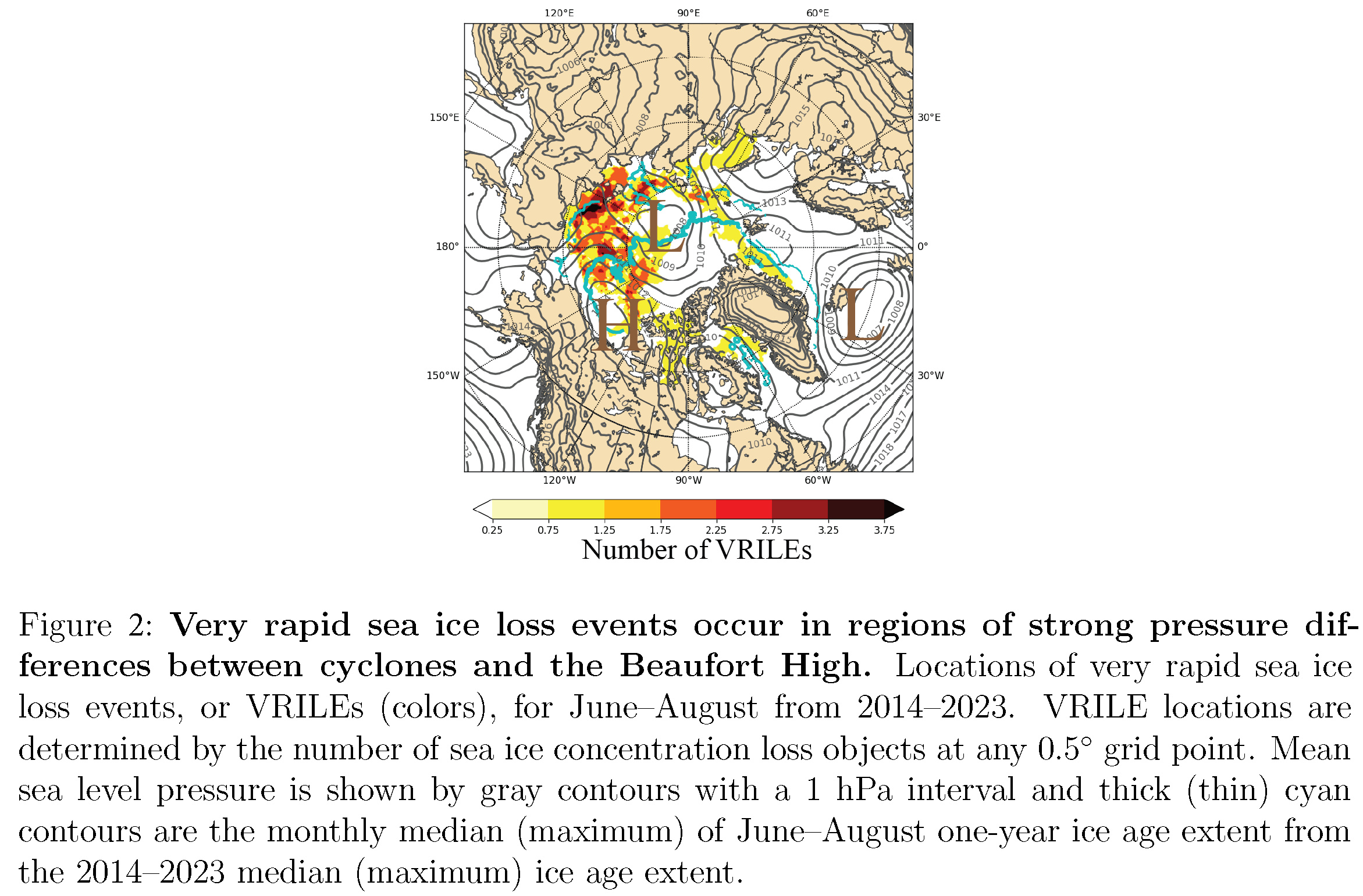 Our research uncovered that that not only must a cyclone need to move over thinner ice but that the pressure gradient around the cyclone must be strong enough to cause surface winds with enough force to both move ice and produce large ocean waves. In other words, if the cyclone was adjacent to a particularly strong high pressure, then certain situations could produce exceptionally strong pressure gradients. This is particularly common on the Pacific sector of the Arctic Ocean in and around the Beaufort Sea because there is a climatological high pressure in this region (Figure 2). Arctic cyclones that formed near the central and western Siberian coast and moved toward the Beaufort Sea were the cyclones most likely to produce these exceptionally strong pressure gradients.