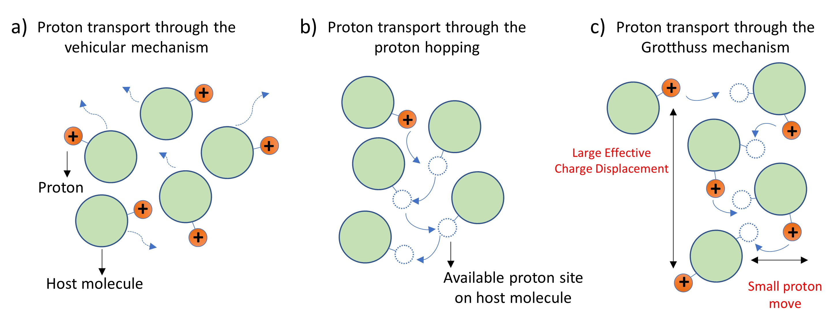 Figure 1. Different mechanisms for proton transport: a) Vehicular mechanism; b) Proton hopping; c) Grotthuss mechanism.