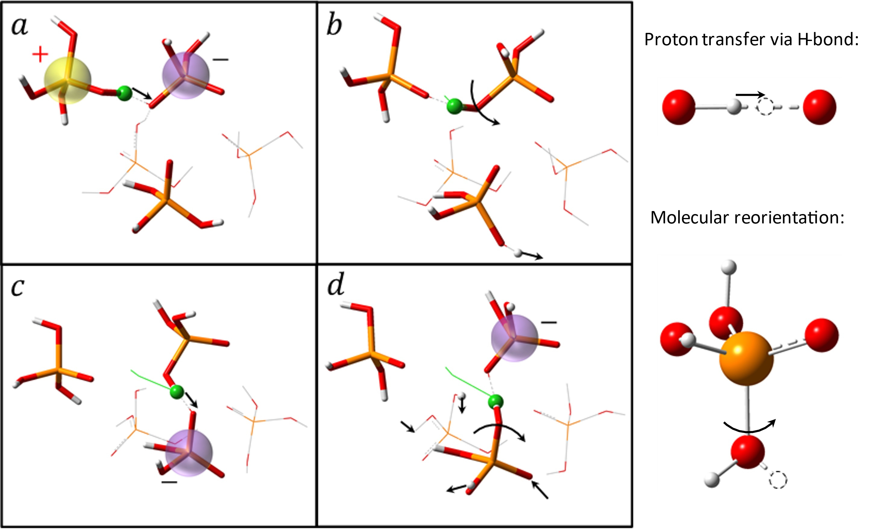 Figure 2. Snapshots of the elementary steps for proton transport in pure PA. The green ball represents the diffusive proton (white, hydrogen; red, oxygen; orange, phosphorus). The green lines show the trajectory line of the proton. The arrows denote the associated proton transfers and the reorientations of the covalent OH bonds around the PO bond axis in the mechanism. The charged entities were highlighted. The collaboration of proton transfers via the hydrogen bond (a and c) and large angular jumps (b and d) facilitates the long-range diffusion of protons.