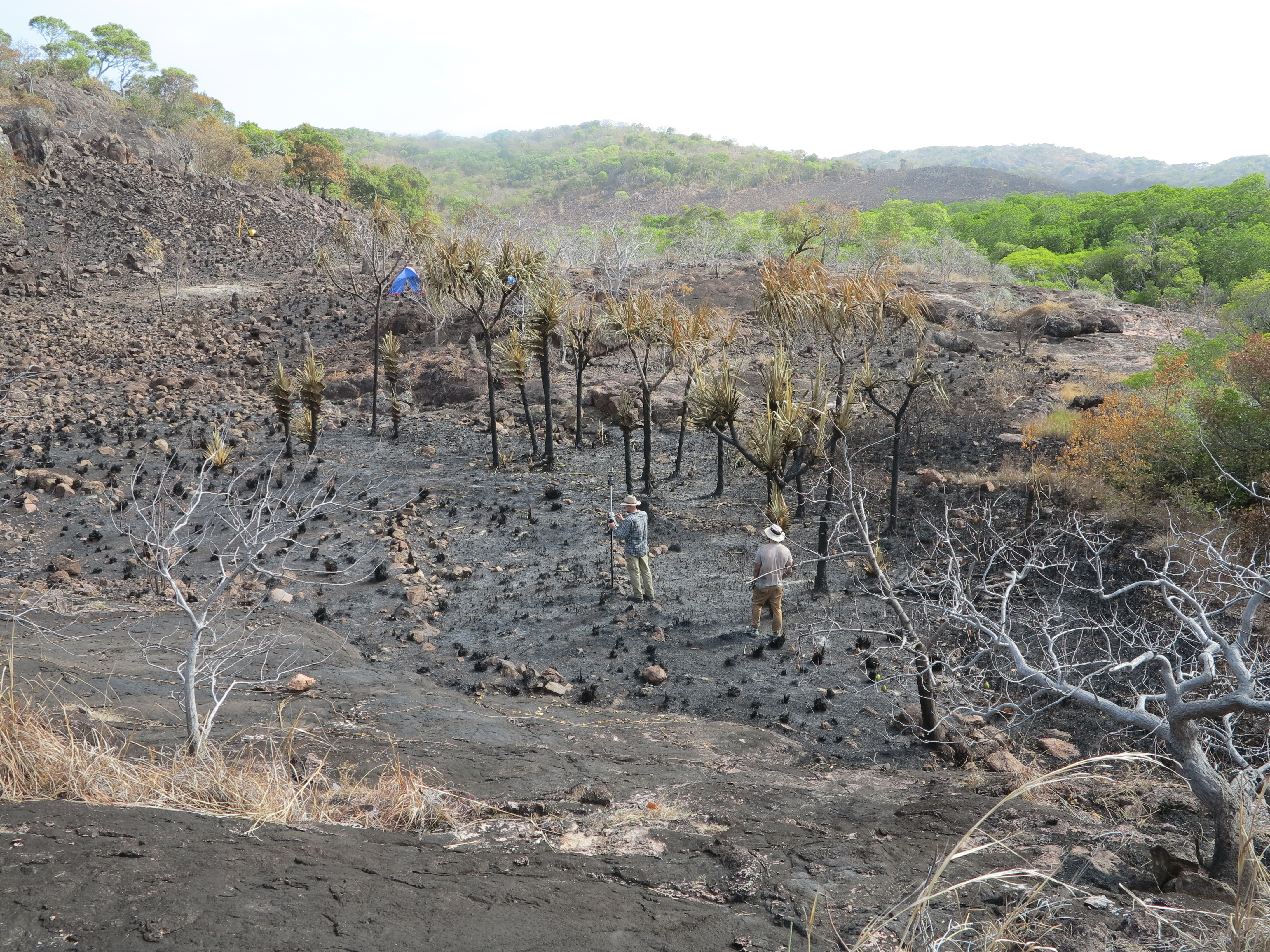 Overlooking a recently burnt Wagadagam village site. The locals were kind enough to burn the area prior to archaeological survey, making our job much easier. Photo: Duncan Wright.