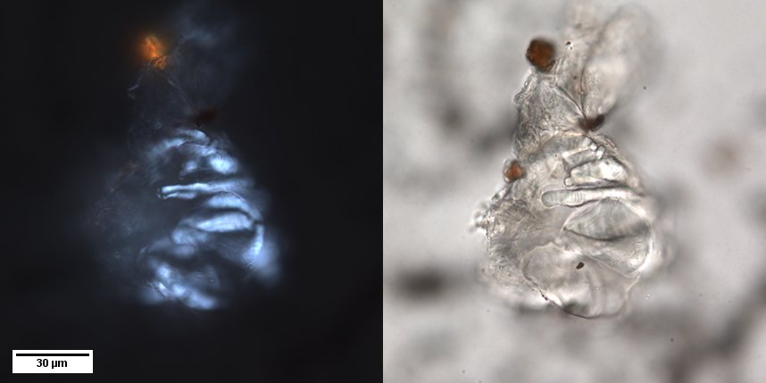 Clumped banana starch isolated from the abandoned garden terrace sediment. Right: image taken using bright field microscopy. Left: under cross polarised light (XPL) displaying the characteristic birefringence and extinction-cross caused by the quasi-crystalline starch structure. XPL is an essential tool for spotting starch on wet-mounted microscope slides as they tend to shoot across the field of view amid a cloudy mass of microscopic debris. Photo: Robert Williams.