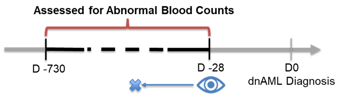 Figure 1. Patients were assessed for abnormal antecedent blood counts from 28 days prior to dnAML diagnosis to up to two years (730 days) prior.