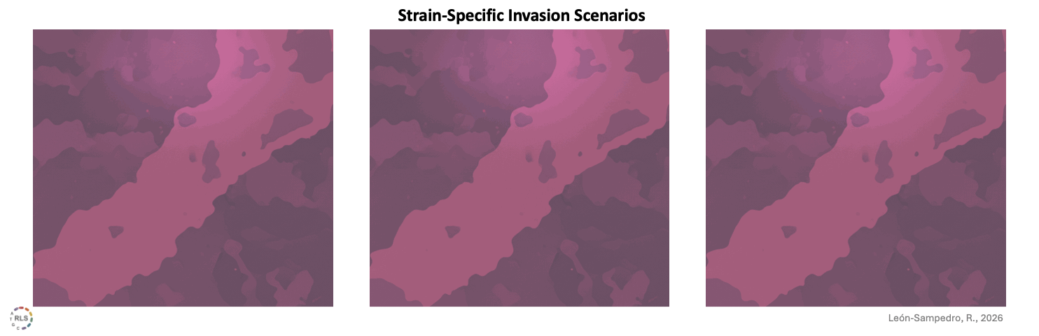 The final balance is driven by the combination of the strain-specific intrinsic growth, intra- and interspecies competition, and community structure across microbiomes. The invasion does not end with a clear success. It ends with an asymmetric distribution of opportunities, set not only by the invader, but by the community it enters and the surrounding environment.