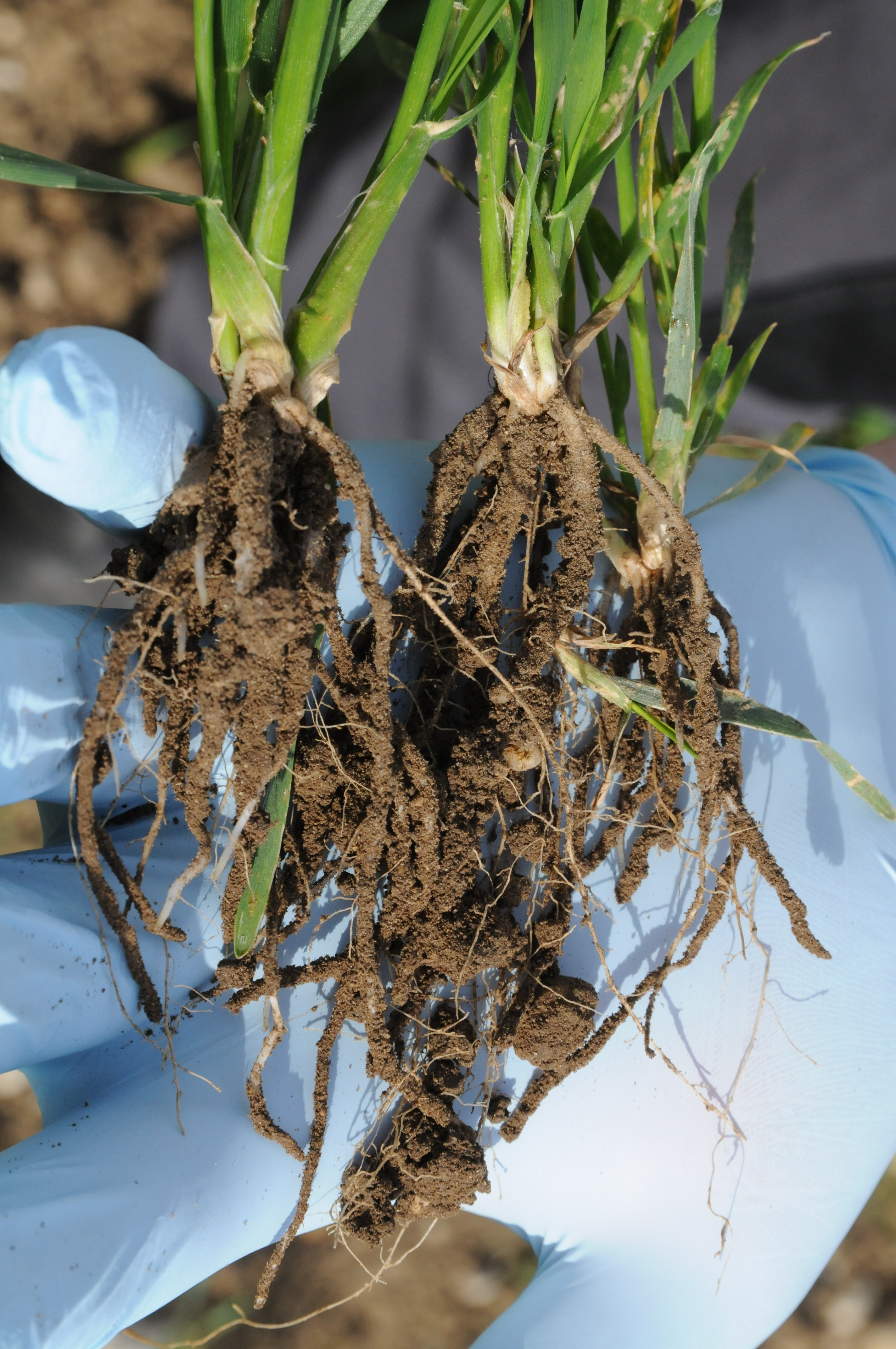 Rhizospheres of two wheat plants sampled in the Grandcour region, Switzerland. Photographed by Christoph Keel.