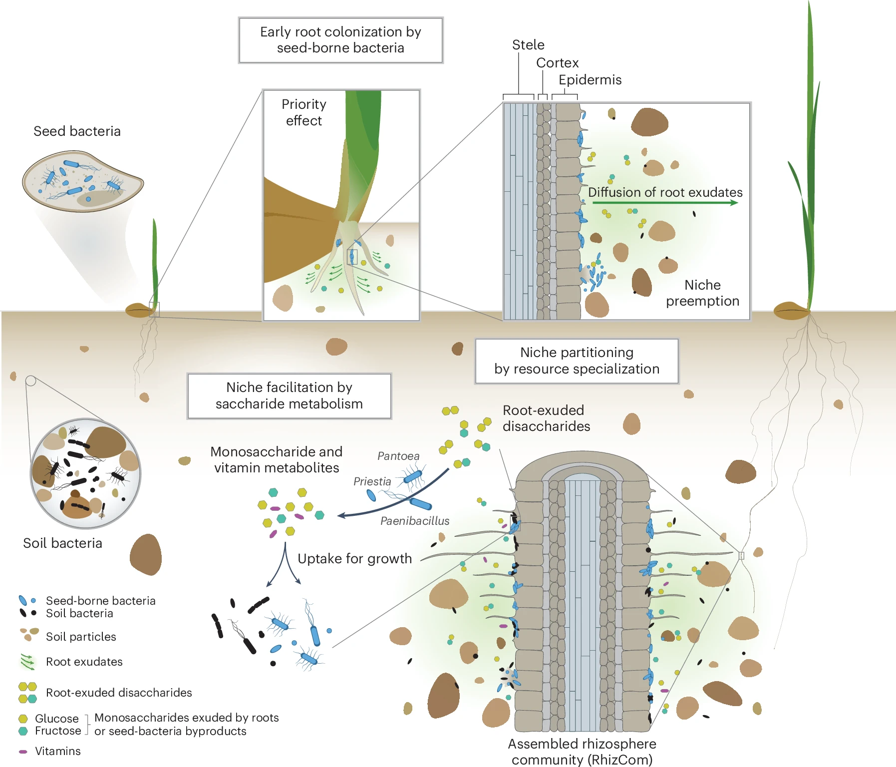 We found that both soil- and seed-borne bacteria had a similar genetic capacity to utilize simple sugars (monosaccharides) exuded by plant roots, which serve as a readily available carbon source for microbial growth. However, because seed-borne bacteria colonized the developing rhizosphere first, we believe they had early access to these plant-derived sugars, allowing them to rapidly colonize and likely deplete these key resources before soil microbes arrived and could compete. This priority effect ecological principle, gave seed-borne bacteria a decisive advantage, enabling them to outcompete late-arriving soil microbes and dominate the rhizosphere microbiome.
