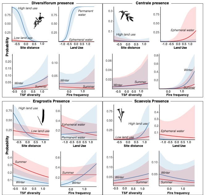 Predicted values of plant presence by distance to nearest residential/archaeological site (at high and low land use), intensity of contemporary land use (at permanent and ephemeral water), time since fire diversity (by season of most recent fire), and fire frequency (by season of most recent fire). Predictor variables are standardized such that a value of 1 equals 2 standard deviations. Shaded error bands indicate 95% confidence intervals for the predicted value.