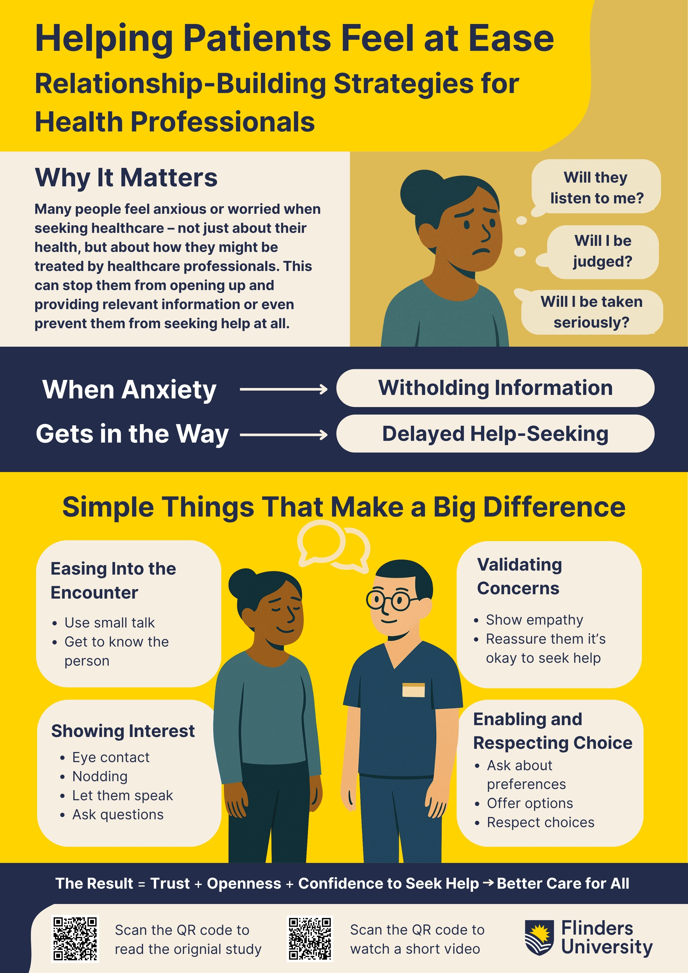 - Feo, Rebecca, Pinero de Plaza, Maria Alejandra, & Lawless, Michael. (2025). Infographic: Helping patients feel at ease – relationship-building strategies for health professionals. Flinders University. Dataset. https://doi.org/10.25451/flinders.29289785.v2