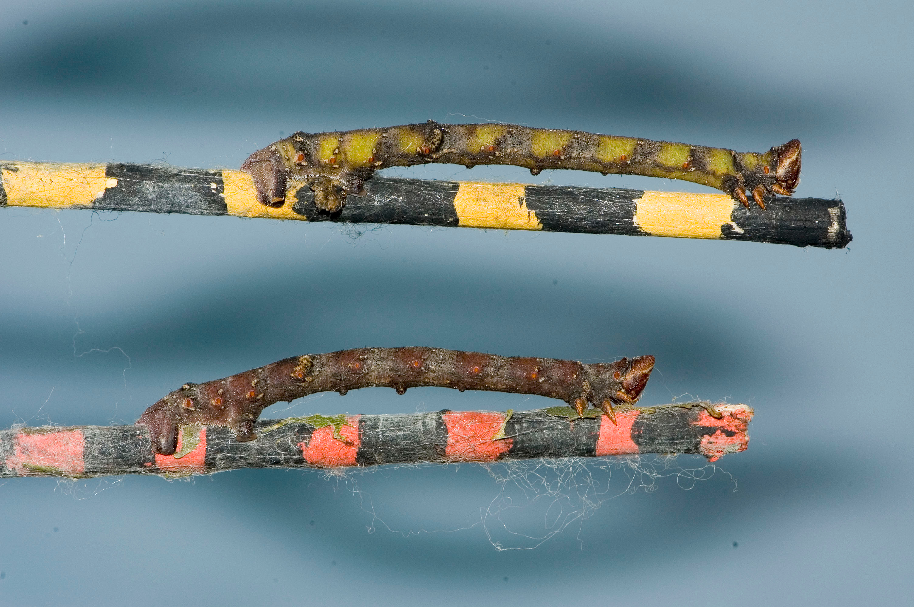This is all well and good if you are an animal living in a visually stable environment, but what if your environment changes rapidly over space and time and you find yourself needing a faster solution to camouflage? The caterpillars of the peppered moth face this problem on a regular basis. Being wind dispersed as tiny larvae just after hatching, they are able to feed on the leaves of the many types of trees and shrubs that they may happen to land on – but which have very different-looking twigs. They have evolved a number of complementary solutions to this survival challenge. Firstly, they look and pose like twigs. Secondly, they change colour to match the twigs they rest upon. These observations had already been published by Noor et al. when I started my Master’s thesis in Ilik Saccheri’s lab at the University of Liverpool. It was suggested that larvae might be using visual cues to better blend into their environment, but no one had yet tackled the fundamental question – what and how do these caterpillars see?