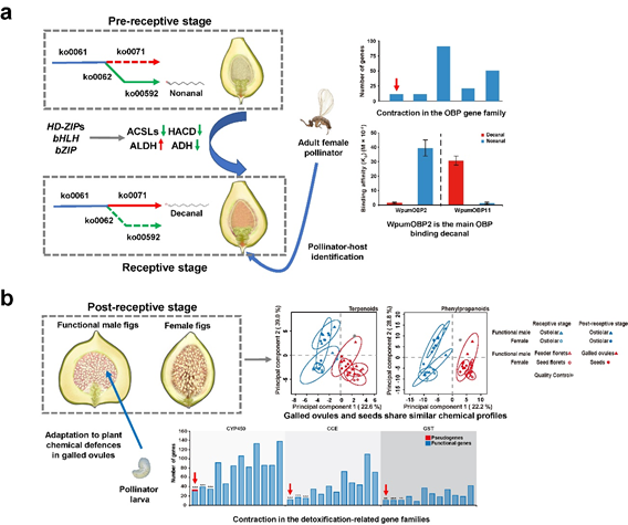 The obligate pollinator-plant mutualisms with a long coevolutionary history and apparently matched traits provide an ideal system for uncovering molecular mechanisms underlying mutualism. Ficus species (producing figs) and their host-specific pollinating wasps (Agaonidae) comprise a classic example of obligate mutualism. Each Ficus species relies on only one or a few pollinating wasp species, and the pollinating wasps can only lay eggs into the ovules (galled ovules) of host plants where their larvae develop at the cost of plant nutrients2,3. Based on their tightly matched life history, two major connections between figs and pollinating wasps are: (1) host figs emit specific volatile compounds to attract pollinating wasps; and (2) larvae of pollinating wasps adapt to the environments especially the plant chemical defences inside galled ovules.