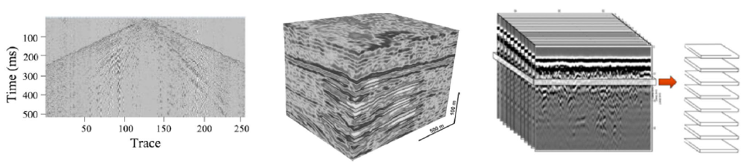 From left to right: 2D seismic gather, 3D seismic cube, and 2D slices extraction from 3D seismic volume