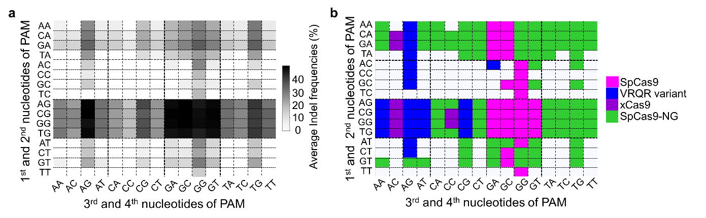 Initially, all possible 4-nt PAM sequences with 30 protospacers were evaluated for PAM compatibilities. After defining indel frequencies that were greater than 5% as functional PAM sequences, we were able to determine that 156 PAM sequences (156 = 89 by SpCas9-NG + 33 by SpCas9 + 26 by VRQR variant + 8 by xCas9) could be targeted with 4 distinct PAM variants from 8 variants that we examined (Fig. 1).