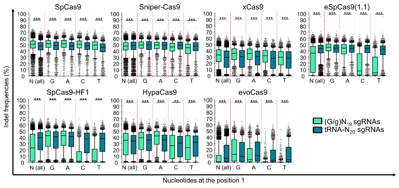 Next, we utilized two sgRNA expression approaches by a U6 promoter to compare on-target activities of high-fidelity variants: (G/g)N19 sgRNAs, 20-nt guide sequences with a G at the 5' terminus that we matched (GN19) or mismatched (gN19) to the target sequences, and tRNA-processed N20 guide sequences (tRNA-N20 sgRNAs) that were perfectly matched to the target sequences. Using high-throughput analysis, we demonstrated that a proper guide RNA expressing system should be used to establish high on-target activities depending on the variants and first nucleotide of the target sequences (Fig. 2).