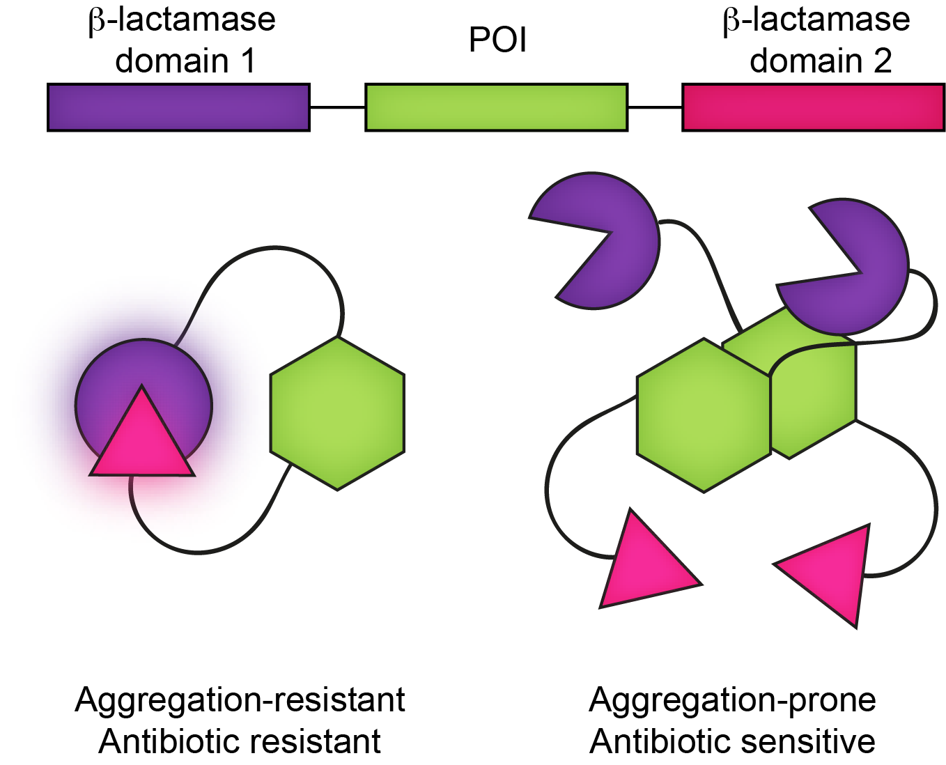 Figure 1 Tripartite β-lactamase screen for aggregation. The protein of interest is inserted between two domains of TEM-1 β-lactamase separated by a Gly/Ser linker. Correct folding of the POI brings together the two domains, providing the bacteria with antibiotic resistance. If the POI aggregates, the activity of β-lactamase is reduced, and bacteria become sensitive to β-lactam antibiotics.