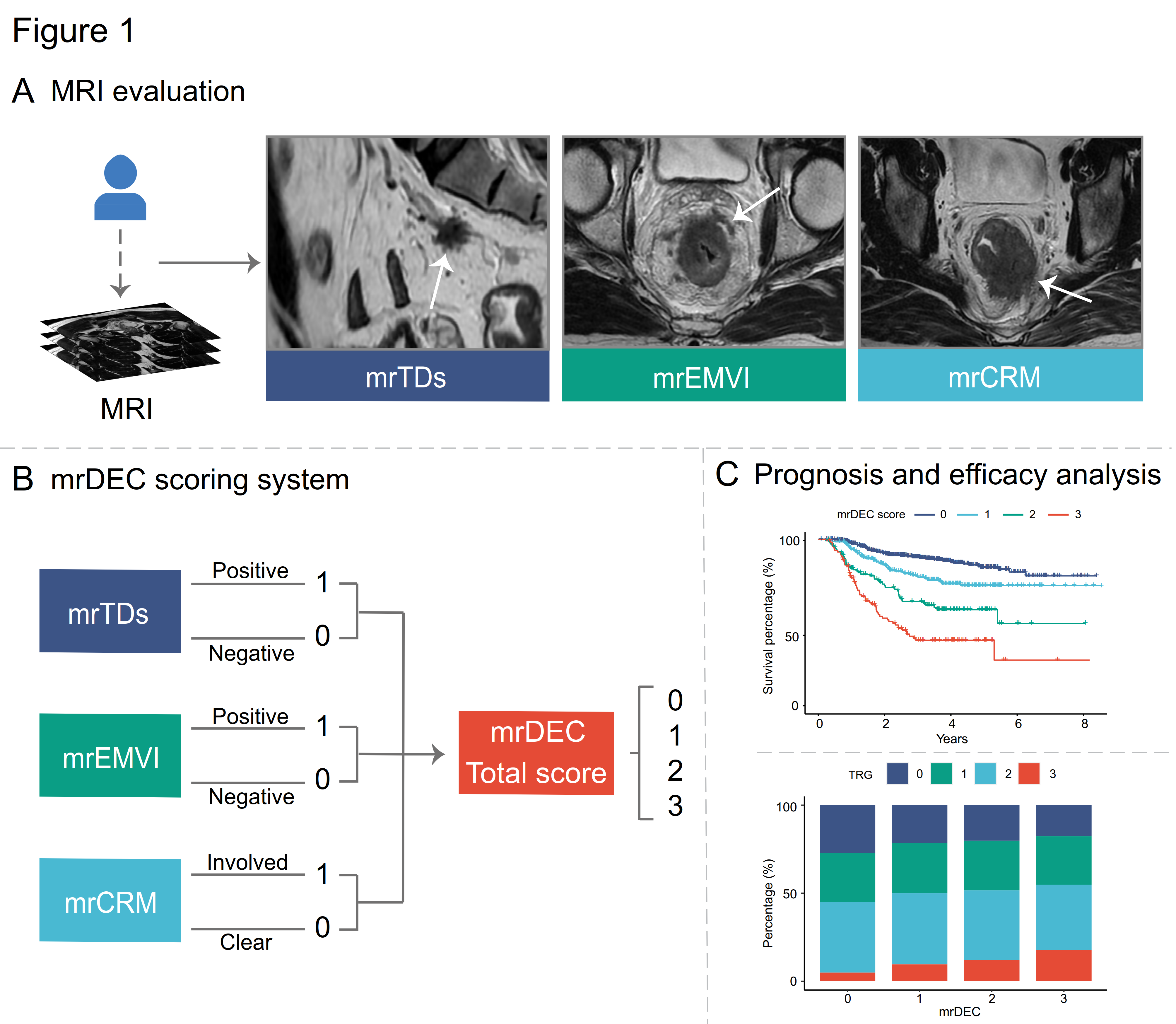 In conclusion, the mrDEC scoring system developed in this study is a reliable and accurate tool for risk stratifying patients with LARC and determining the need for intensive nCRT. The multicenter validation study demonstrated the prognostic ability of the mrDEC scoring system for patient outcomes, and its prognostic performance surpasses that of single MRI marker. The mrDEC scoring system has the potential to improve treatment decision-making and patient outcomes in clinical practice.