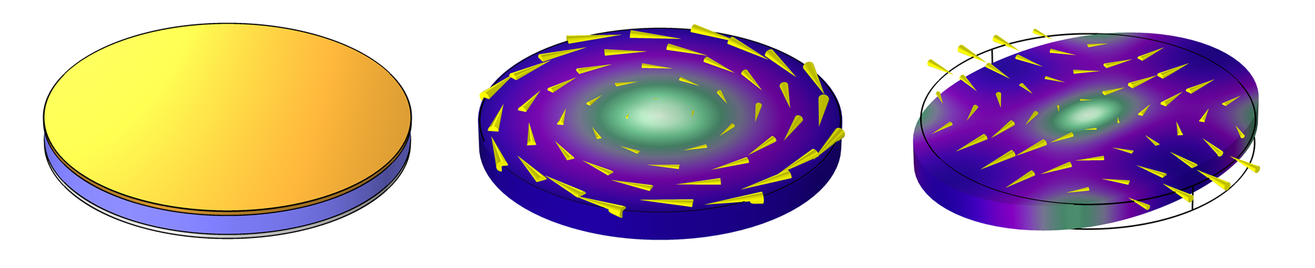 Figure 2: (a) Schematic drawing of a PMN-PT disk with single gold electrode. (b) Tangential mode shape with displacement vectors quiver plot overlaid. Note that the volume of the disk does not change since all displacement is tangential, not radial. (c) exaggerated deformation depiction of wine-glass mode shape with displacement quiver plot overlaid using PMN-PT and single electrode