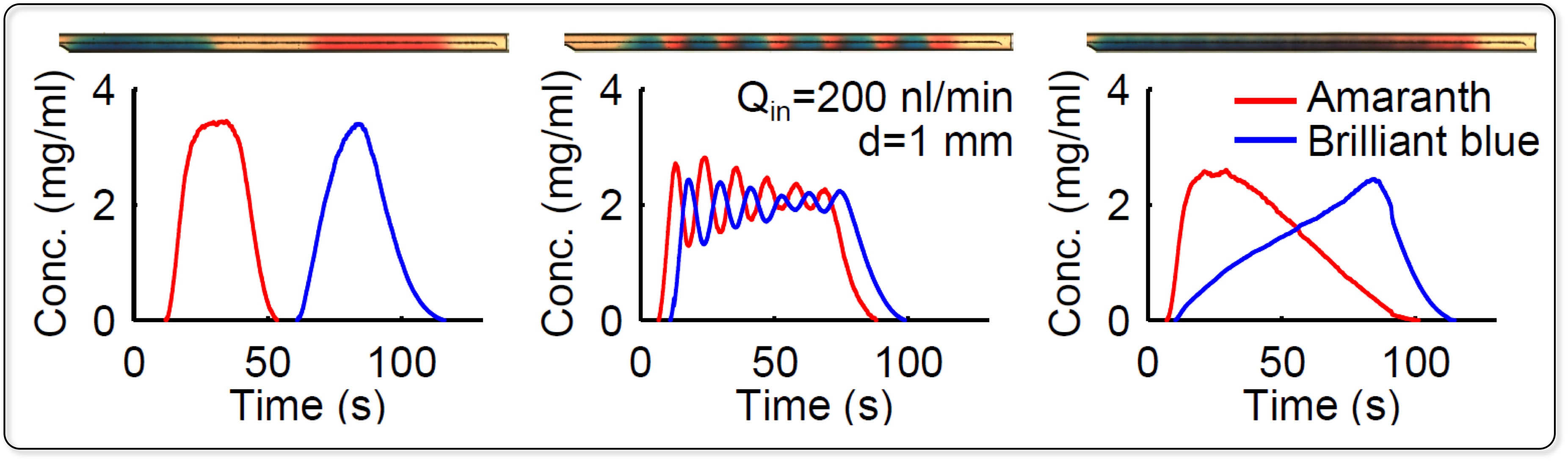 Once reagents are reconstituted in a well-defined line inside a Self-Coalescence Module (SCM), they can be sent to another SCM containing reagents for a second reaction step, or to a “detection zone”, a point downstream in the channel where a measurement would be made (via surface-based capture, optical readout, electrochemistry, etc.). Since we have a single-phase flow in a regular channel during this transit, Taylor dispersion is now unavoidable. However, it can be minimized over a distance if reagent plugs need to be separated or maximized if they need to be mixed together. Taylor-Dispersion in a straight channel of constant cross-section can be exactly modeled using Green’s functions, which yield a powerful design tool to “shape” the amplitude of dried reagent concentration profiles. This way, we demonstrated that the basic operations of microfluidics: sending reagent plugs, mixing, and gradient generation, could all be accomplished automatically with a SCM (see image below). Pulse shaping of light is a domain of its own in optics. We have now something analogous for chemical pulse shaping in a dispersive fluidic medium.