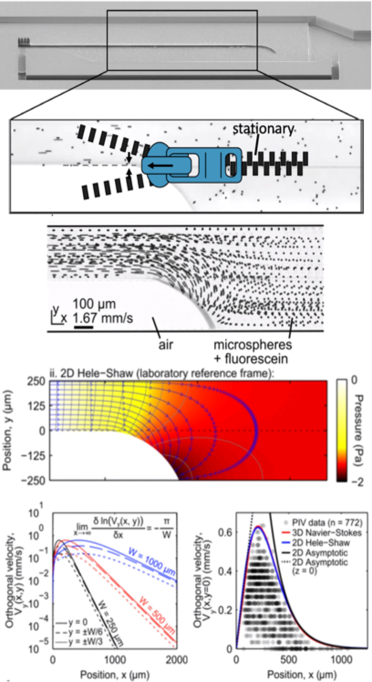 After a little reengineering of the device to bring out the fundamental physical aspects, the team was able to make several key observations towards understanding this new phenomenon we had already termed “self-coalescence”. First, we observed that, although the flow had free boundaries, a class of problem known to be very hard to study numerically, it became very regular and smooth when viewed in the reference frame of the moving meniscus rather than in the laboratory reference frame. Indeed, the laws of fluid mechanics (i.e. the Navier-Stokes equation) do not depend on the observer reference frame and give us some freedom on the perspective from which a problem can be studied. Secondly, self-coalescence occurred in channels that were much wider than high, effectively inducing a Hele-Shaw flow, a quasi 2D viscous flow that, paradoxically, can be characterized with powerful mathematical tools developed to study 2D purely inviscid flow fields, like complex variable representation, potential flows, and conformal mapping.