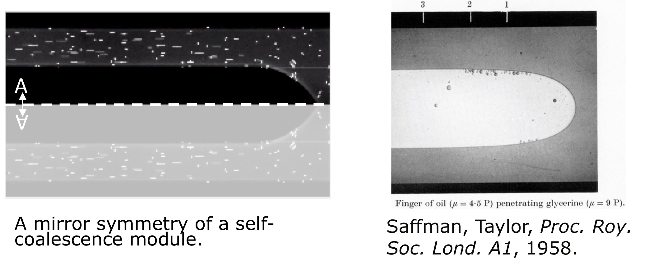 After a first round of review, a more theoretically oriented reviewer of our manuscript made an extremely thoughtful observation which forced us to take a deeper look at our discovery from a classical fluid dynamics perspective. The flow looked like another classical problem, also solved by G.I. Taylor in the 1950s: the displacement of a fluid phase in a rectangular channel by another immiscible fluid phase, also called Saffman-Taylor viscous fingering (STVF). Self-coalescence in a channel indeed looks like the upper symmetrical half of a receding viscous finger (see images below).