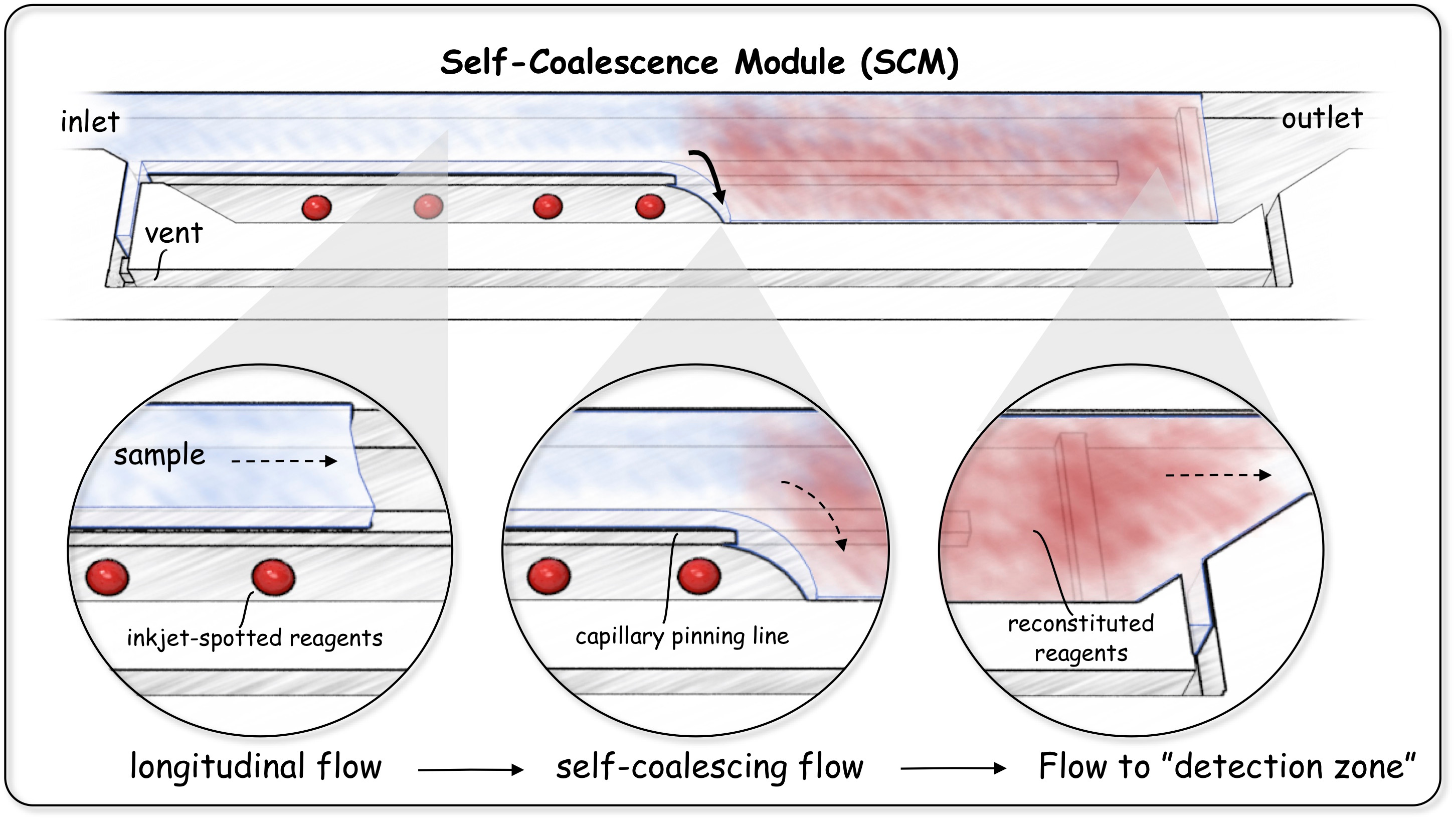 Of course, while similar, there are several differences between SC and STVF. First of all, SC is induced by a pinning along a capillary line and has very well-defined contact angles making the flow different at the meniscus tip. Secondly, due to the capillary pinning, SC enables the generation of “finger” shapes that would not be physically possible in the classical phenomenon. Finally, and more importantly from an application perspective, there would be no way to reconstitute reagents inside a receding STVF, as one would need to spot after the fluid phase is introduced.