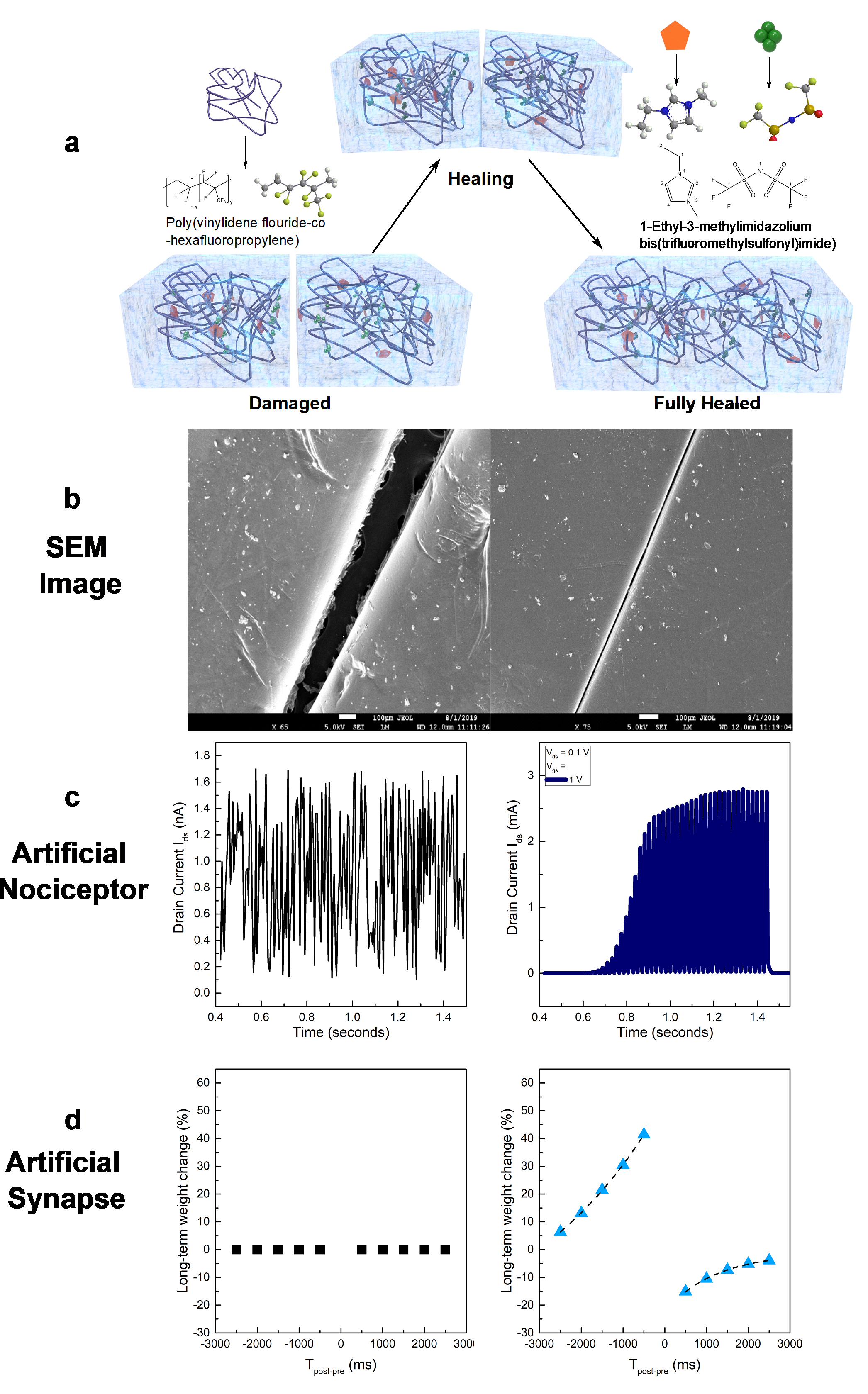 Figure 2. Self-healable neuromorphic elements. a Schematic of the mechanism of healing. b SEM images of the self-healing ion gel dielectric. c healing behaviour of our artificial nociceptors and d artificial synapses.