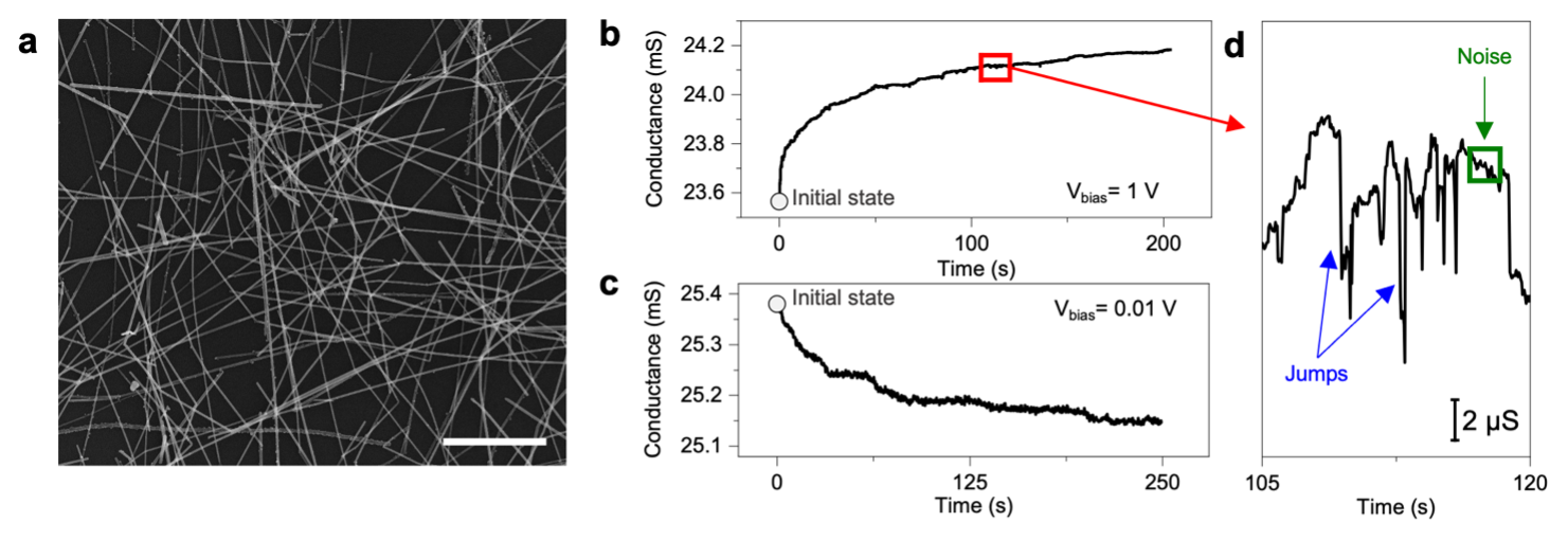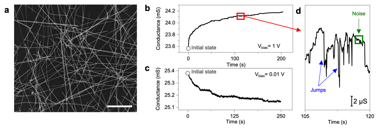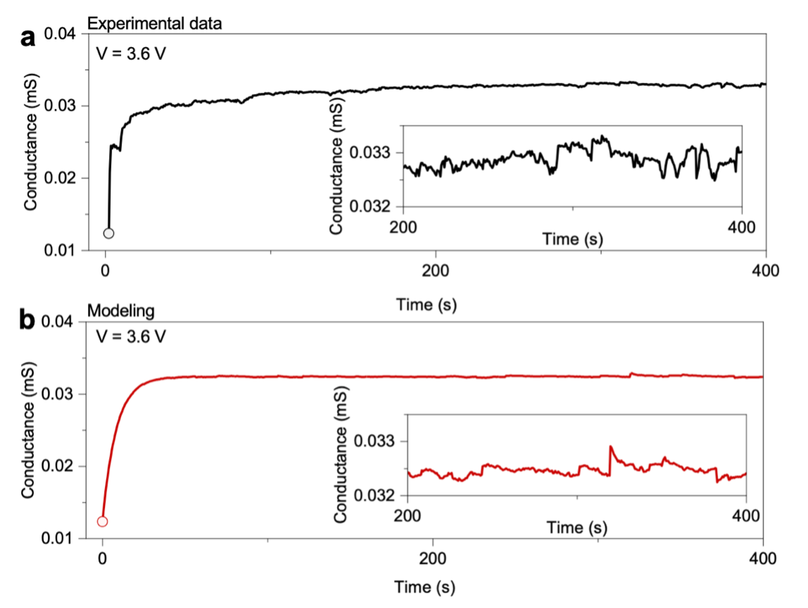 Figure 1a reports an image of the self-organizing nanowire network while Figure 1b-d reports examples of network dynamics in terms of the evolution of the conductance time trace as a function of time under voltage stimulation. As can be observed, network dynamics are characterized by deterministic trajectories and stochastic effects including noise and jumps. These effects can be holistically described through a unified mathematical framework as an Ornstein-Uhlenbeck process with noise and jumps, as can be observed in Figure 2 where an example of experimental and modeled time trace is compared.