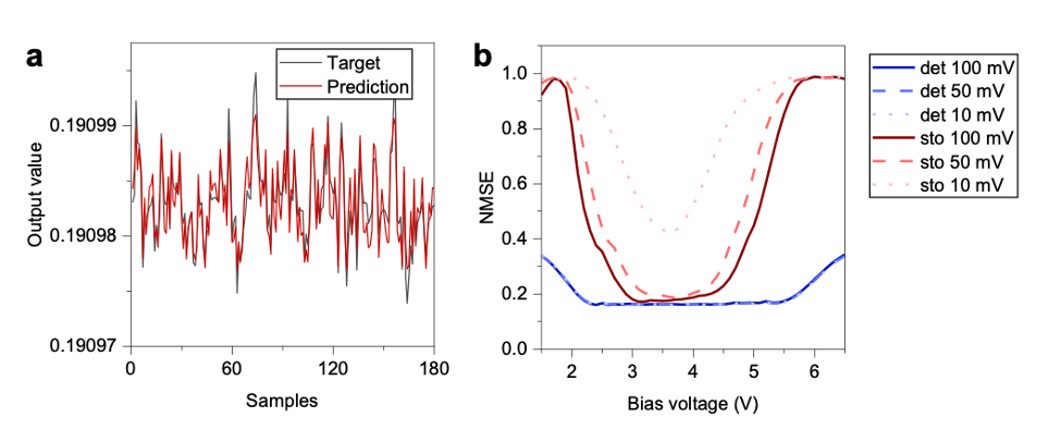 Figure 3. Reservoir computing in nanowire networks. a. Prediction of the NARMA-2 task obtained through the stochastic modelling approach when the network operates under the bias voltage of 3.6 V. b. results of the NARMA-2 task in terms of NMSE as a function of operating conditions in terms of the bias voltage, by considering deterministic and stochastic dynamics and different input amplitudes.