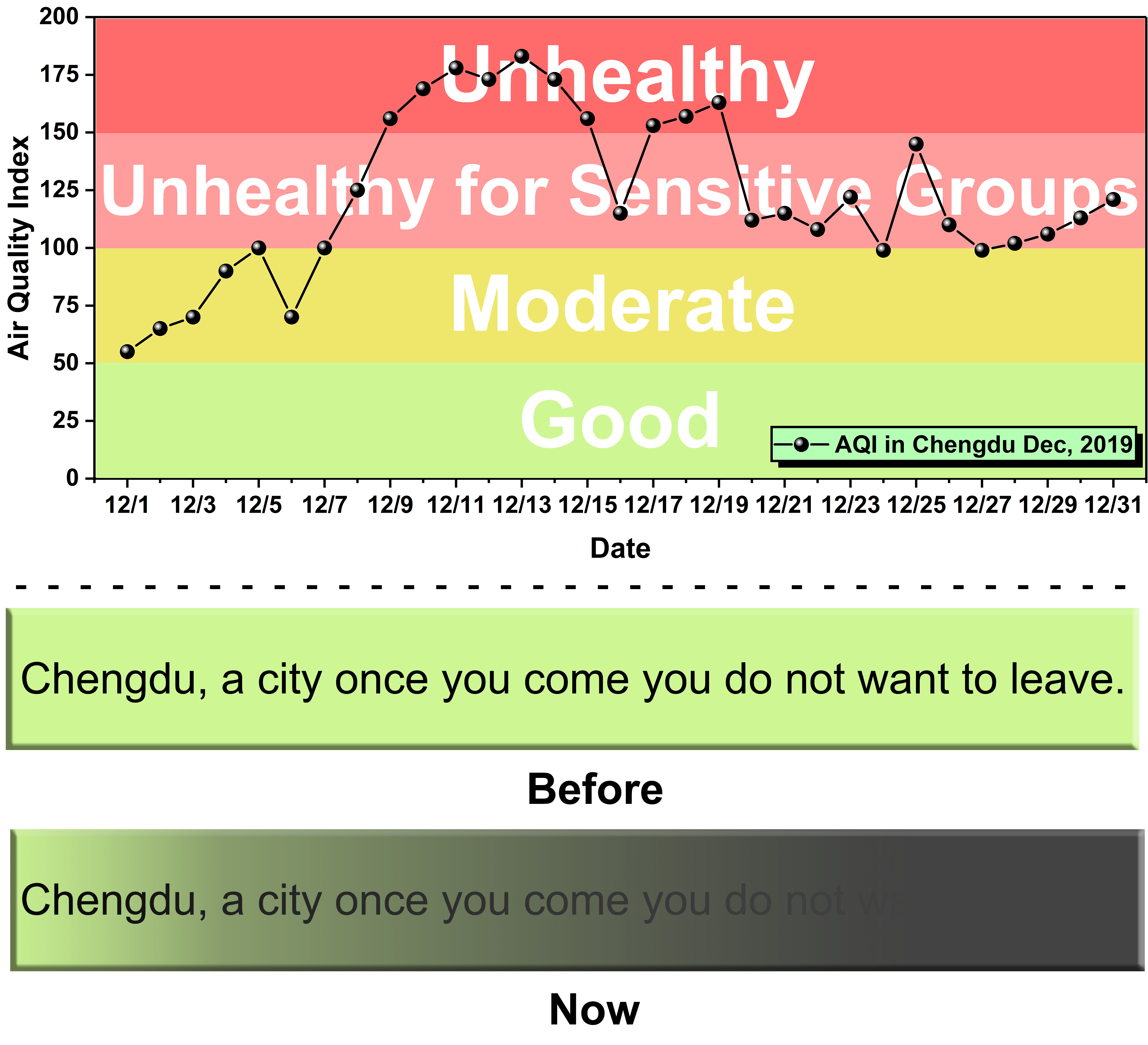 Top: Air quality index of Chengdu in Dec, 2019. Bottom: The air quality changes in Chengdu.