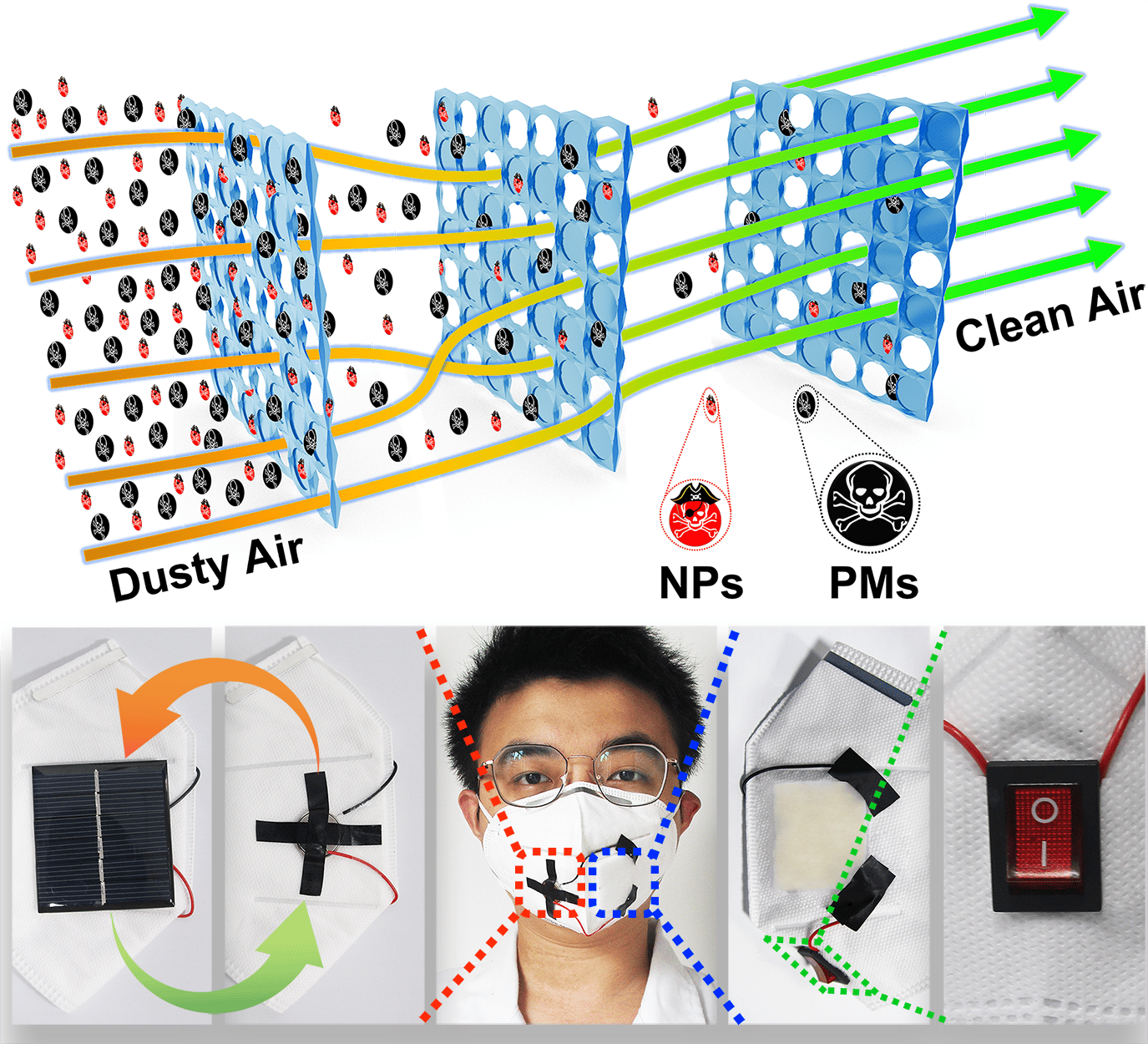 Top: Illustration of the removal mechanism of the multilayer ILP@MF filter. Bottom: Personal face masks fabricated by self-powered ILP@MF filter.