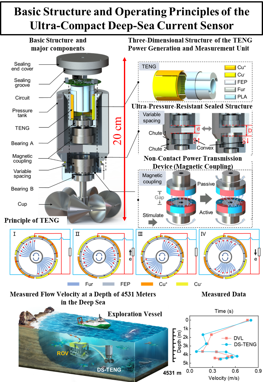 The DS-TENG deep-sea current sensor developed in this study enables long-term high spatiotemporal-resolution simultaneous measurements and autonomous energy supply in deep-sea environments. This advancement is expected to play a crucial role in deep-sea research and environmental monitoring. Specifically, it can contribute to solving various marine issues, such as elucidating deep ocean circulation, advancing deep-sea life sciences, and understanding the dynamics and storage mechanisms of deep-sea blue carbon