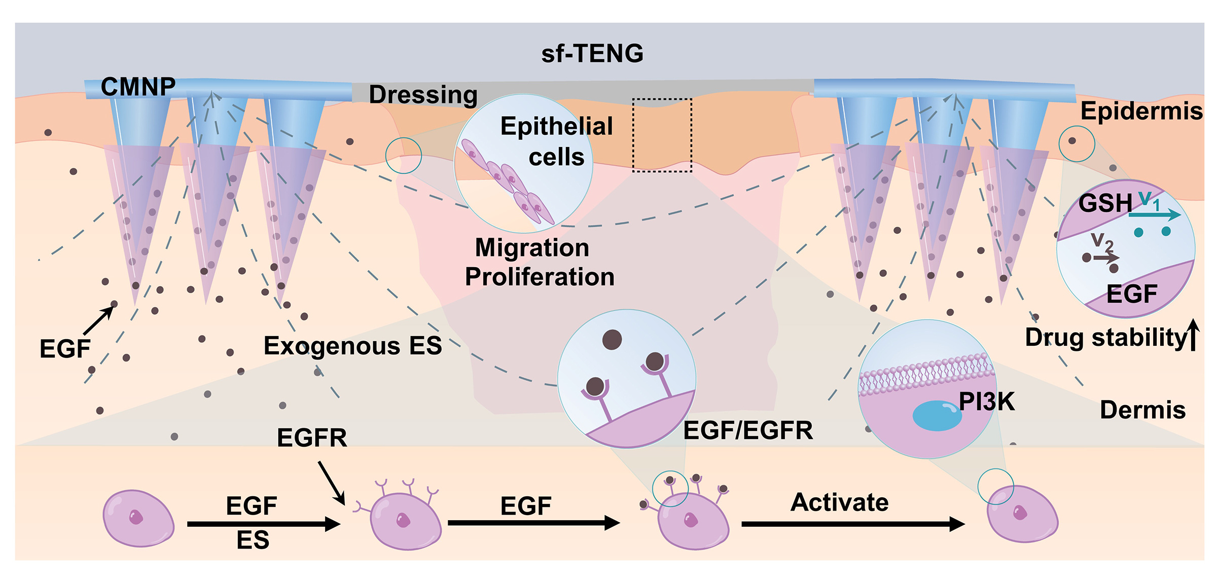 In light of this consideration, we designed a microneedle-based self-powered transcutaneous electrical stimulation system (mn-STESS) to improve the pharmacodynamics of EGF in wound treatment. The integrated mn-STESS consisted of a sliding free-standing triboelectric nanogenerator (sf-TENG) and two-stage gold-coated polylactic acid/cross-linked gelatin–cross-linked hyaluronic acid (PLA-Au/cGel-cHA) composite microneedle patches (CMNPs). The mn-STESS was wireless, passive, and easily attached to the skin. The built-in sf-TENG converted the biomechanical energy generated by finger sliding into biosafe microcurrent without causing skin damage or drug inactivation. CMNP penetrated the stratum corneum and continuously released EGF into the skin for 24 hours. Meanwhile, CMNP utilized the current generated by the sf-TENG for transcutaneous ES. As an electrical adjuvant, self-powered ES improved the pharmacodynamics of EGF in various aspects. (1) mn-STESS enhanced penetration rate and utilization rate of EGF. mn-STESS could pierce the stratum corneum and continuously release EGF into the skin, enabling long-term transdermal drug delivery. (2) mn-STESS suppressed the reduction reaction against EGF by modulating the molecular motion behavior of GSH. ES produced by mn-STESS did not change the protein activity, but altered the molecular movement behavior of GSH. Molecular dynamics calculations showed that the electric field generated by mn-STESS significantly increased the intermolecular distance between GSH and EGF, thereby inhibiting the reduction of EGF by GSH. (3) ES generated by mn-STESS upregulated EGFR expression, thereby compensating for receptor desensitization. From cell to animal experiments, it has been confirmed that mn-STESS possessed a strong receptor sensitization effect, which completely overwhelmed the drug-induced downregulation of EGFR. The comprehensive improvement of EGF pharmacodynamics by mn-STESS further activated the EGF/EGFR pathway and downstream PI3K, thereby promoting cell proliferation and migration. Translational medicine studies showed that mn-STESS promoted wound re-epithelialization, vascularization, and hair follicle formation, ultimately accelerating the wound healing process.