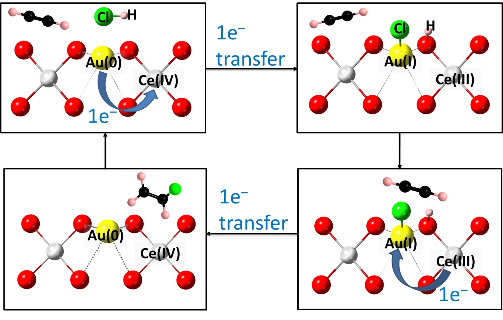 We have chosen to investigate the direct catalytic hydrochlorination of acetylene by supported Au atoms and address their stability and aggregation issues on cerium oxide as this support surface can be associated with facile redox properties of Ce(IV)/Ce(III).