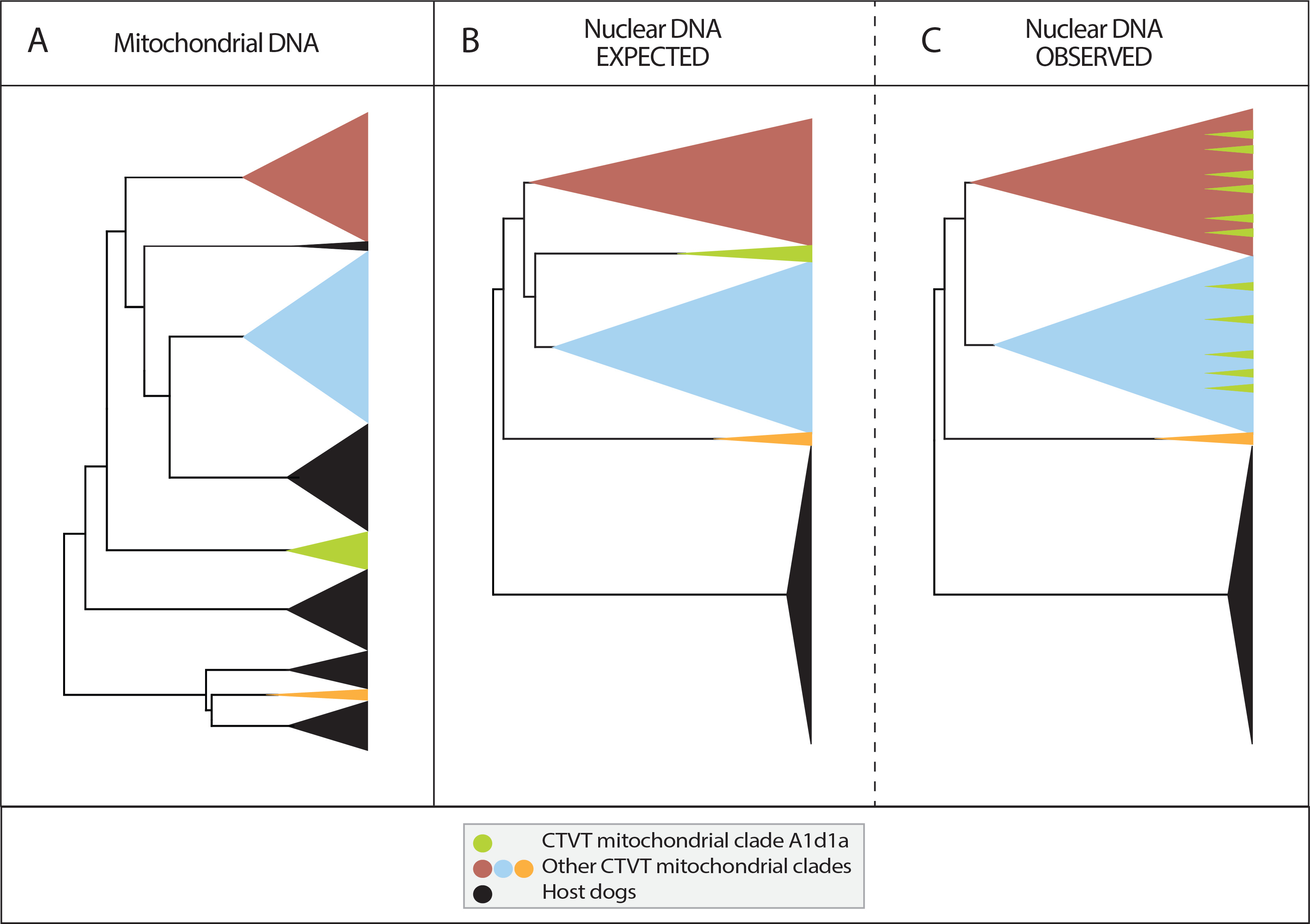 Using mitochondrial genetic variation, we were able to track CTVT’s history – but only up to the point when each mitochondrial horizontal transfer happened, the oldest of which occurred 1,000-2,000 years ago8. We therefore turned to analysing the nuclear genomes with the goal to understand the full history of CTVT and the relationships between these mitochondrial clades5 – which is where the recent Nature Communications study story began9. We expected to see the mitochondrial clades each clustering on their own branches of the nuclear tree (constructed using exome sequences from the same set of samples) (Figure 2B). And this was indeed what we saw for most of the clades.